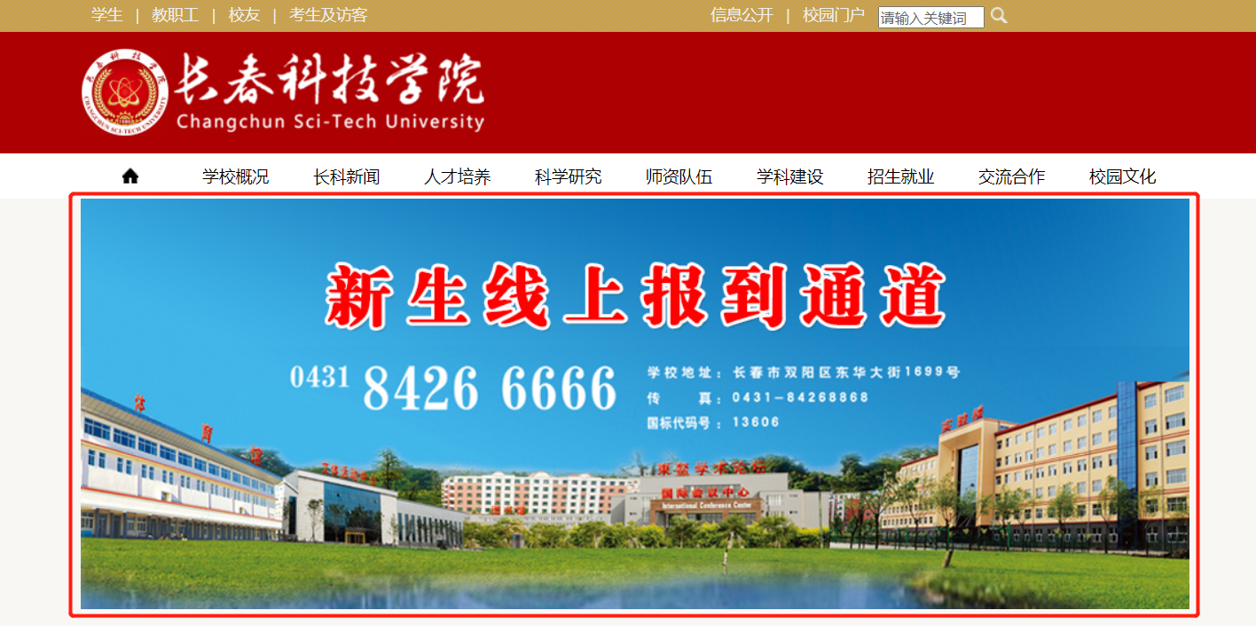 或通过电脑访问长春科技学院官方网站:http://www.cstu.edu.cn,点击“新生线上报到通道”进入线上报到平台。
