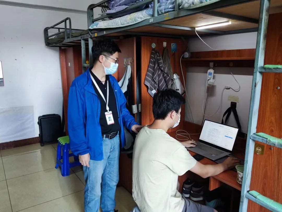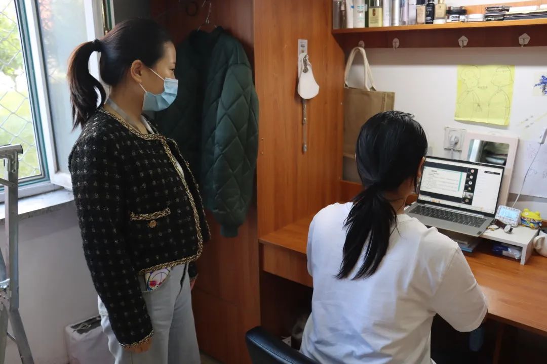 在查寝过程中,辅导员向大家解释学校的防疫工作的具体要求,提醒同学们正确佩戴口罩,注重寝室卫生,及时通风,提高自身要求的同时提升网课学习效果,让学习和抗疫“共赢”。