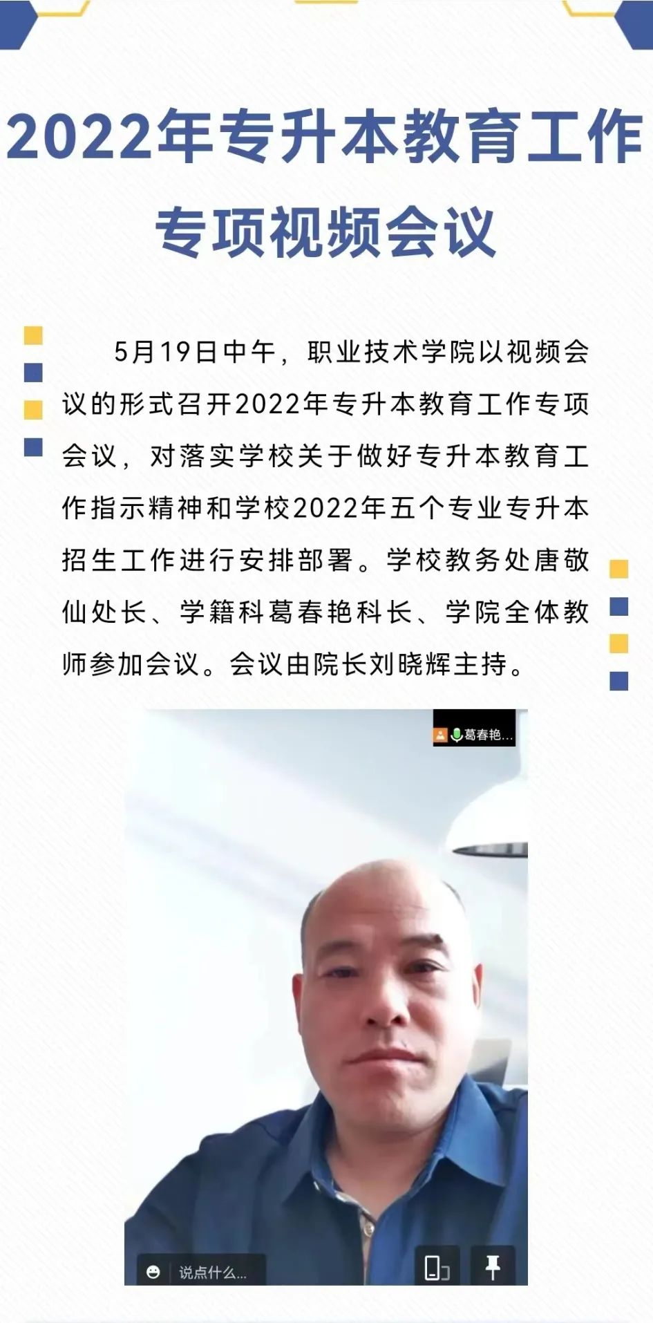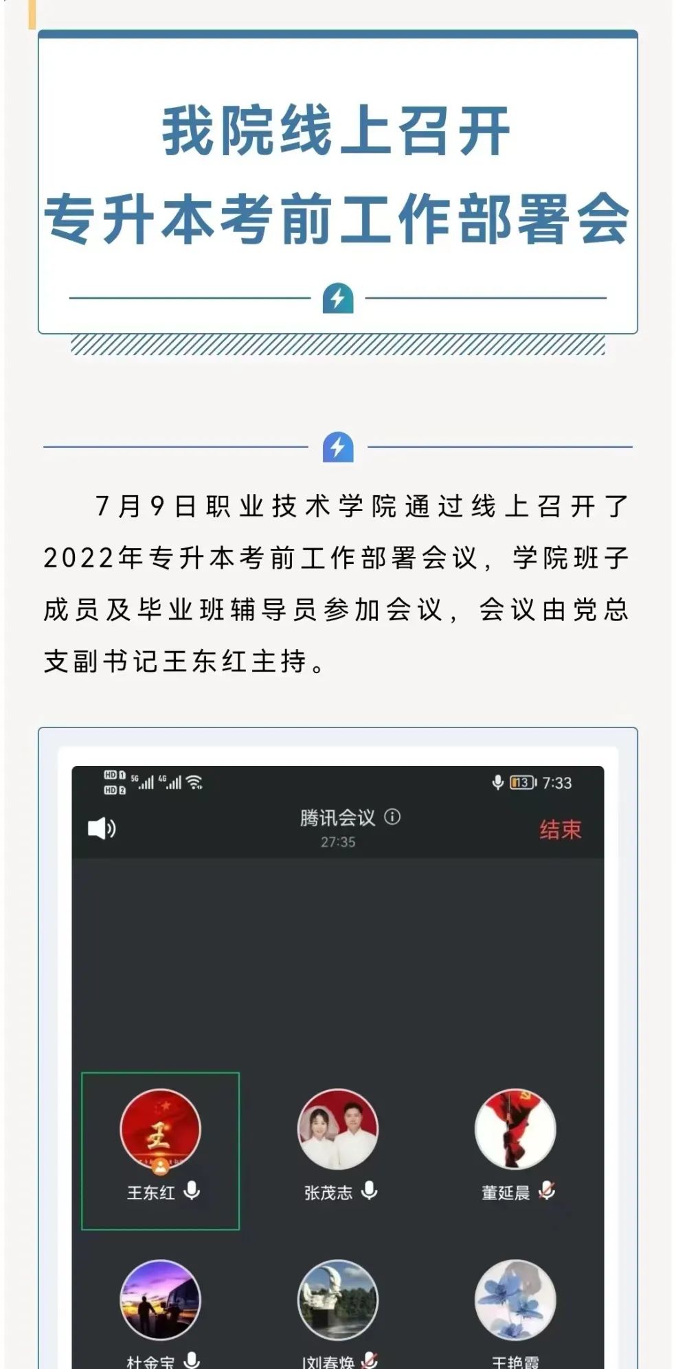 由于受新型冠状病毒肺炎的影响,吉林省教育厅对今年的专升本工作提出了新的要求。我院高度重视,院长刘晓辉,党总支副书记、副院长王东红,副院长张井柱多次组织召开专题会,研究部署2022年专升本考试工作。疫情防控期间,按照教育厅要求,辅导员全面摸排考生详细信息,建立相关台账,通过微信、电话等方式落实考生身体健康情况、核酸完成情况等,实时掌握学生动态,不落一位学生,不漏任何信息,做细做实疫情防控相关工作。