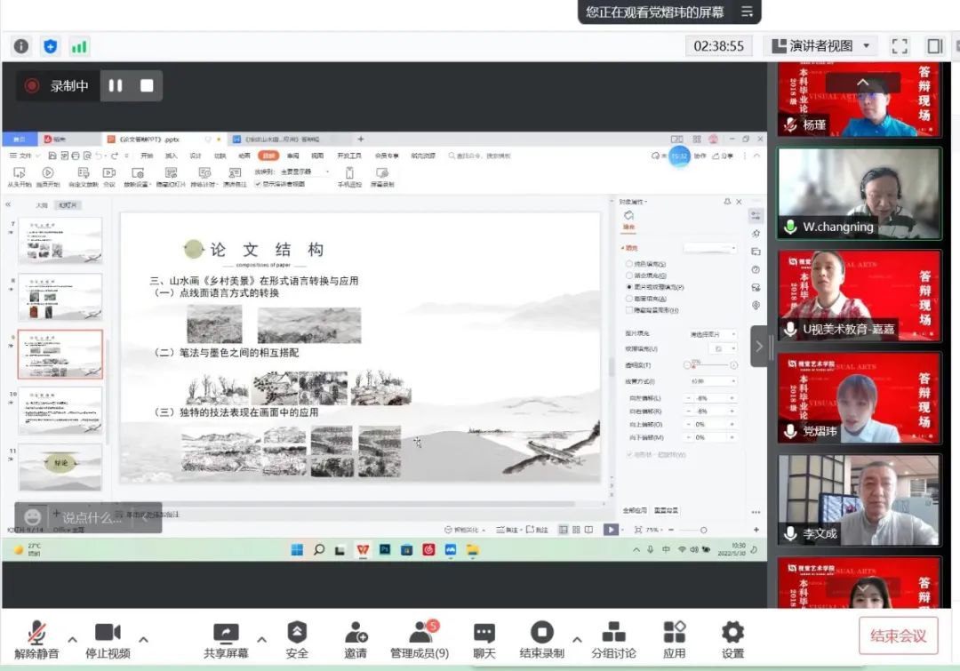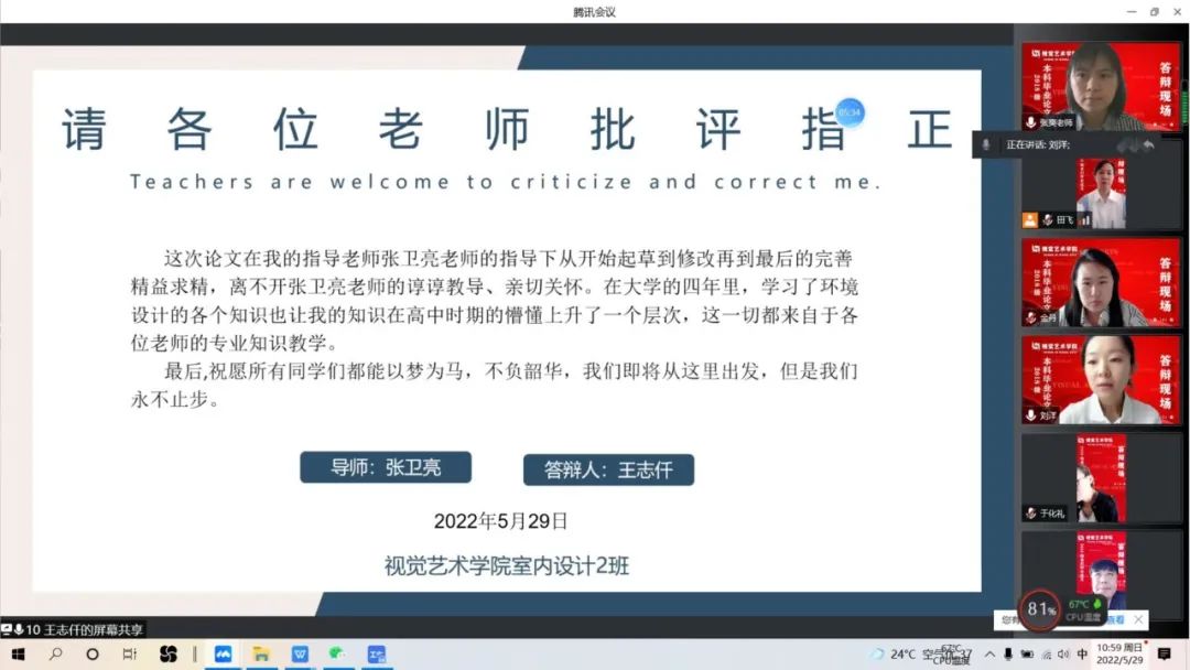 四年时光韶华作渡,一次结语青云成书。为检验我院2022届毕业生的论文研究成果,考察综合素质以及相关知识的应用能力,提升论文质量,5月29日与30日,视觉艺术学院在学校统一安排部署下,举办了2022届本科毕业论文“云答辩”。本次共有255名18级学生、35名教师参与线上论文答辩,分为五组同时进行,历时两天圆满完成。