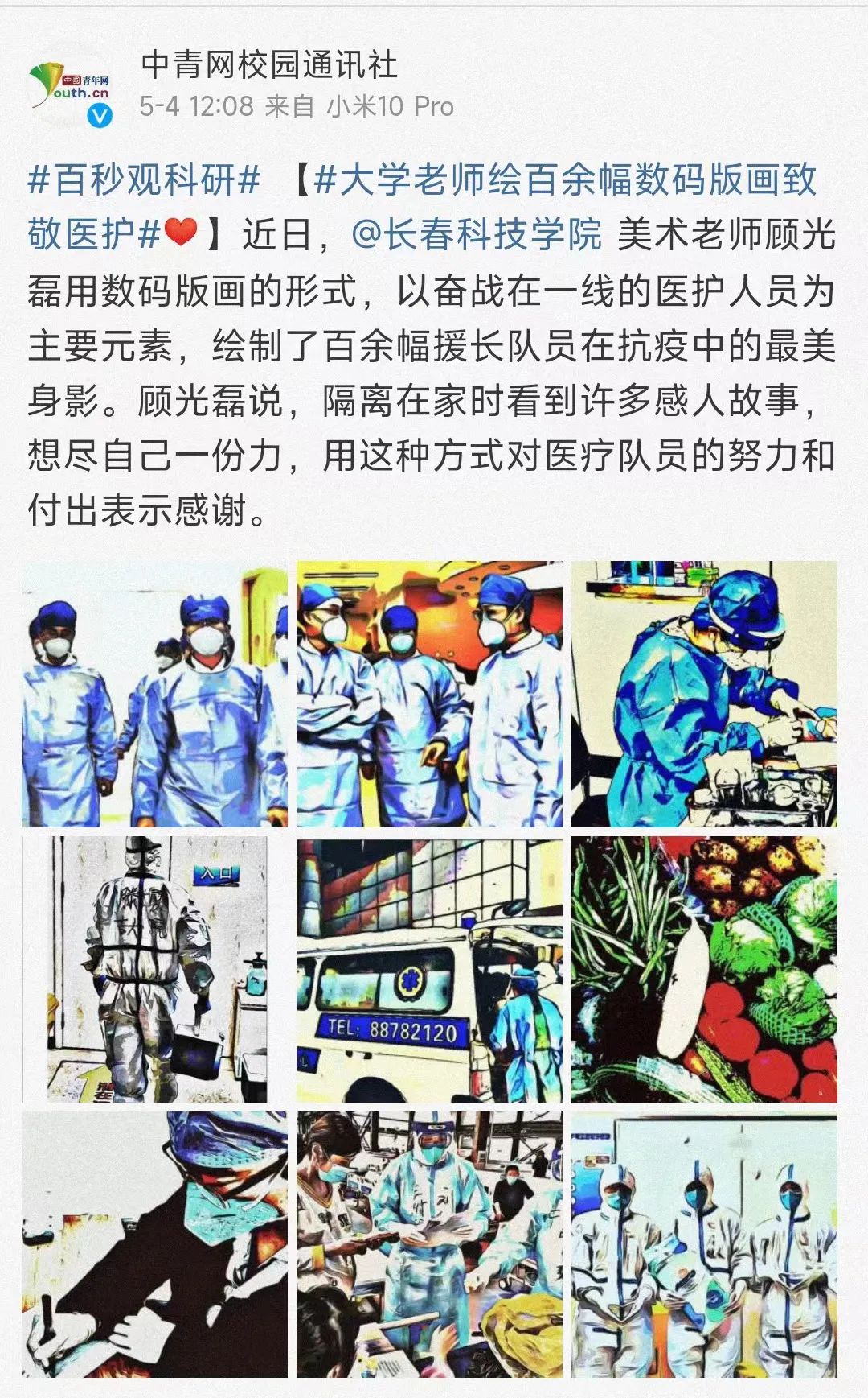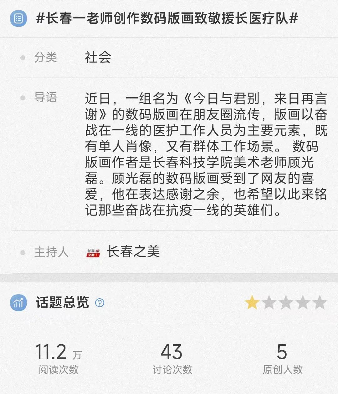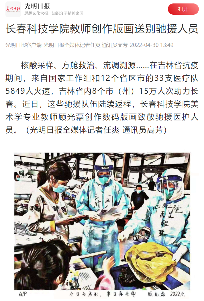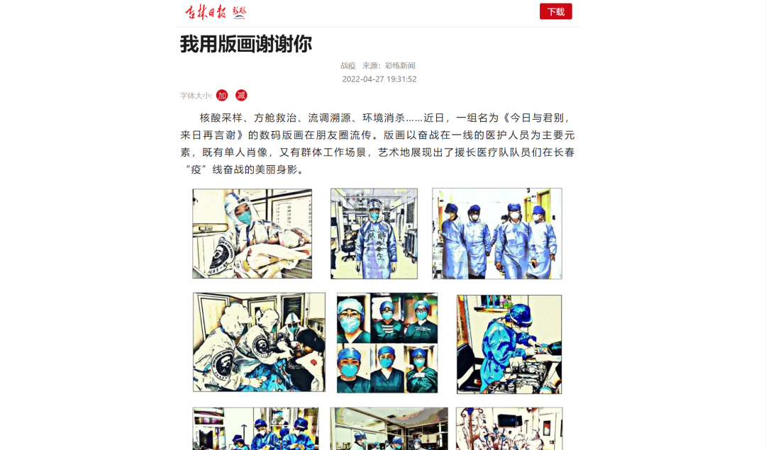 版画的作者是长春科技学院美术老师顾光磊,这些版画以奋战在一线的医护工作人员为主要元素,既有单人肖像,又有群体工作场景,艺术展现了援长队员在长春“疫”线“战斗”最美身影,再现了各路医疗队员并肩作战、共抗病魔难忘瞬间。