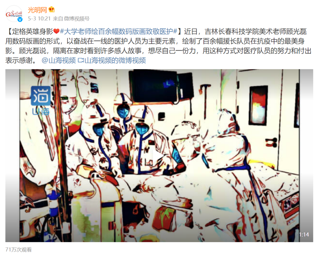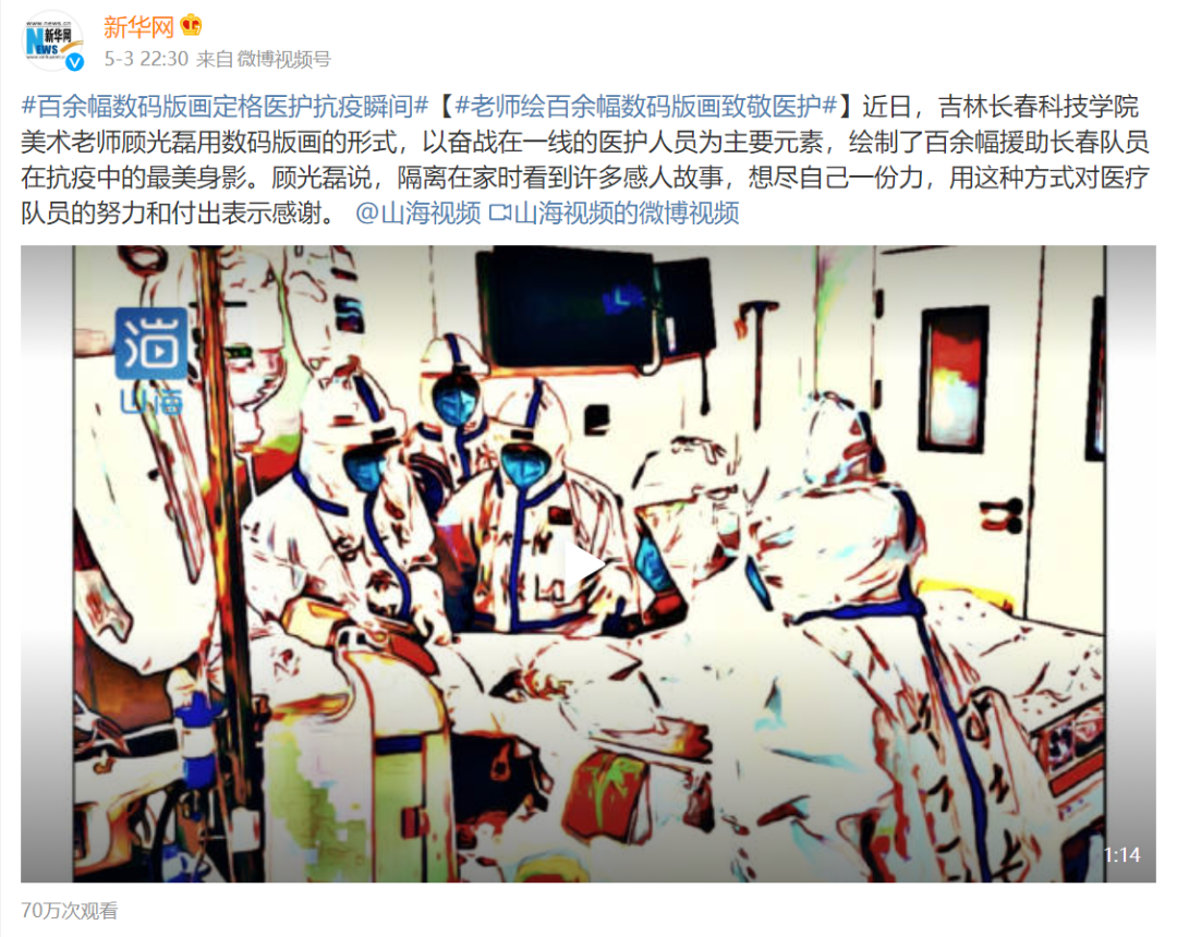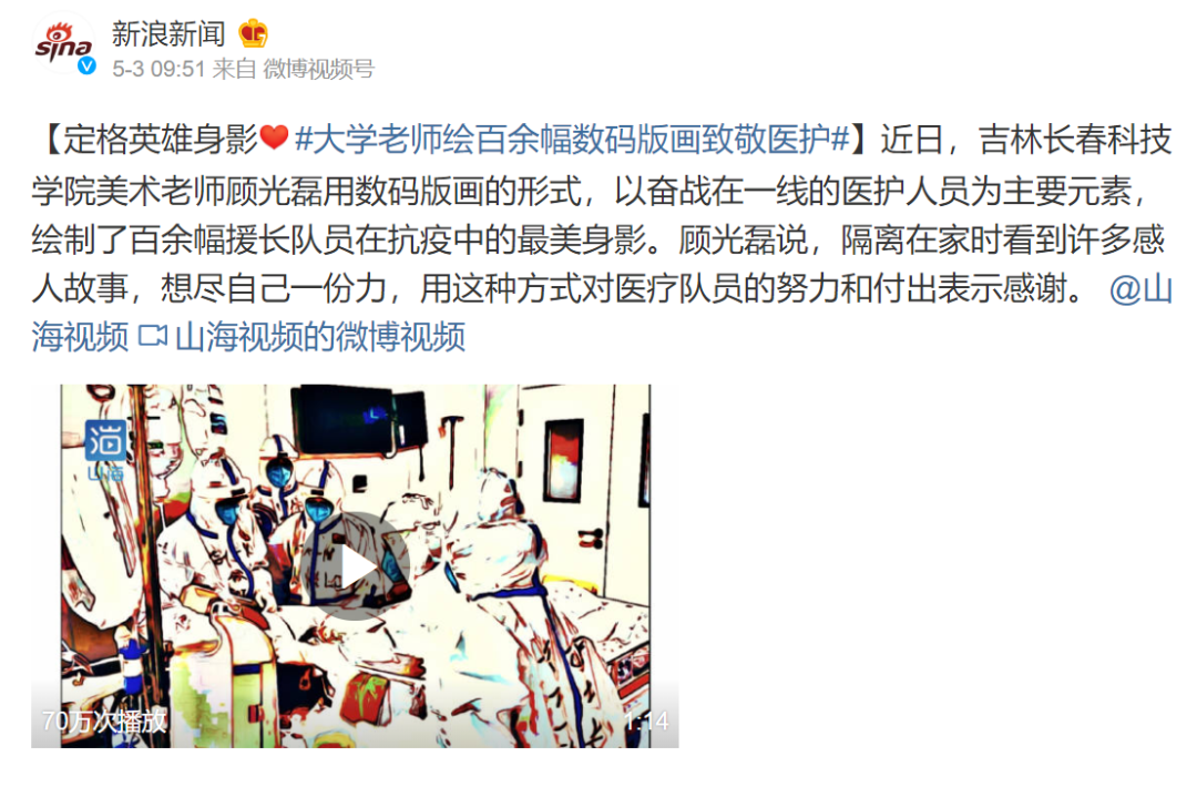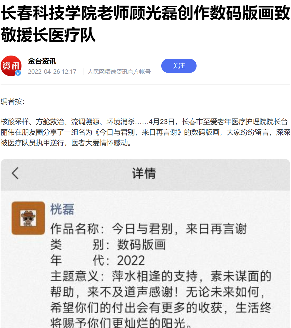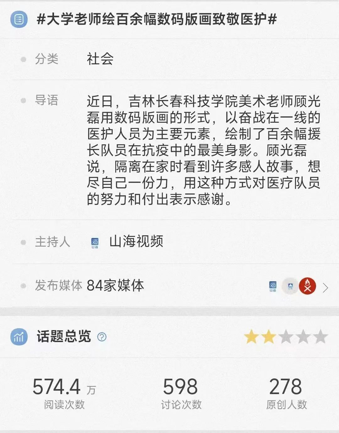 版画的作者是长春科技学院美术老师顾光磊,这些版画以奋战在一线的医护工作人员为主要元素,既有单人肖像,又有群体工作场景,艺术展现了援长队员在长春“疫”线“战斗”最美身影,再现了各路医疗队员并肩作战、共抗病魔难忘瞬间。