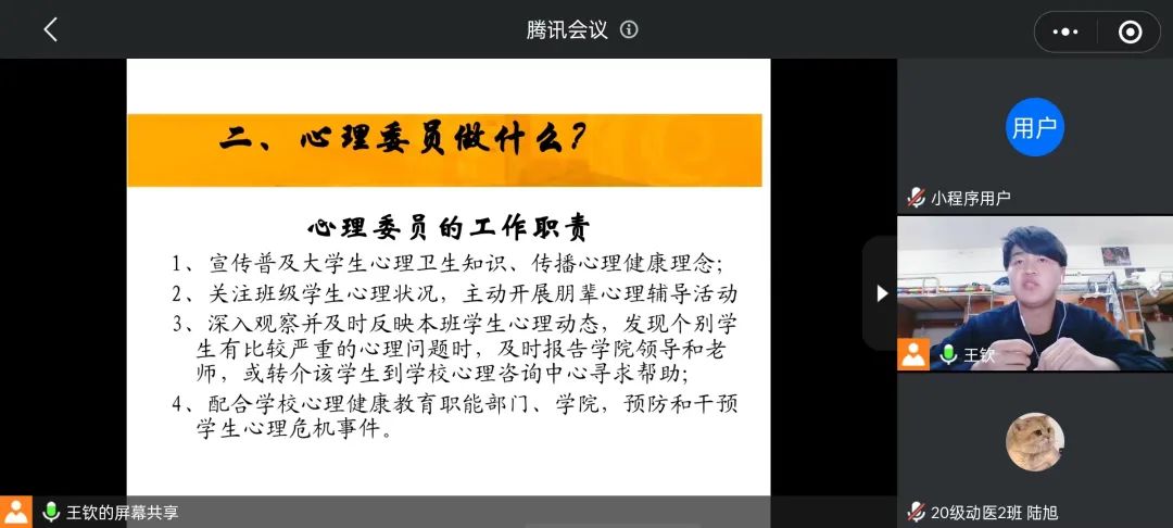 随后王钦同学从心理委员的职责、工作技巧和策略等方面为大家进行详细讲解。他指出,朋辈心理辅导员应加强责任意识,提高心理自助与助人的能力,努力营造积极向上的心理抗疫环境。