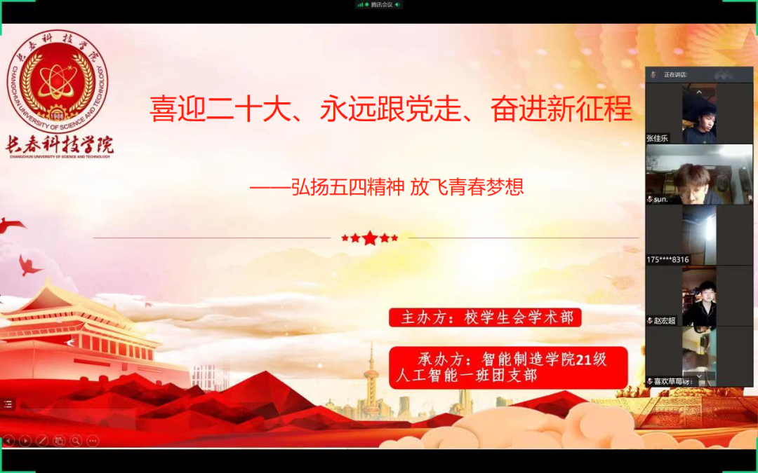 疫情当前,五四青年节随之到来。为弘扬五四精神,也为了激励同学们时刻牢记使命,智能制造学院于2022年5月4日展开线上团会。
