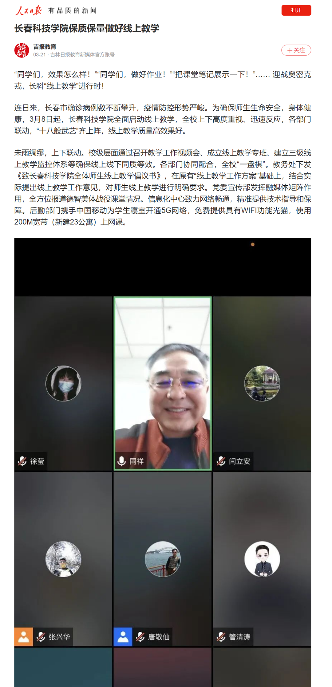 “If Winter comes, can Spring be far behind? (要是冬天已经来了,春日怎能遥远!)” 面对疫情,长春科技学院统一战线成员迅速行动,发挥统战优势、全力投身疫情防控工作,以强烈的家国情怀和社会责任感为打赢校园保卫战贡献智慧和力量。无党派代表人士张电达董事长身先士卒,带领长科党政领导和相关部门负责人、辅导员以及后勤保障部门员工共同坚守抗疫一线,采取多种“硬核”举措确保校园安全。3月17日,20级电子商务学生王思瑀突发面瘫,详细了解情况后,立即通过多种渠道找寻专家,咨询治疗方案。安排特聘教授刘志贤为其治疗,确保学生第一时间得到救治。党外知识分子用“四心”“四课”坚守教育阵地。九三学社社员、林刚副教授充分利用自我开发完成的慕课,采用“直播课+速课+慕课+二课堂英语活动”的创新教学模式,以寝室为单位开展直播互动教学活动,实现线上教学方式的多样化。