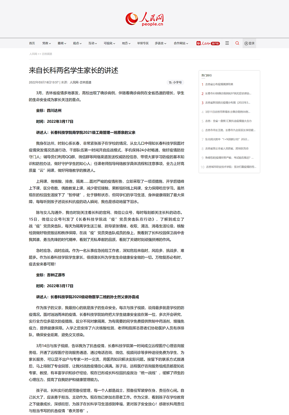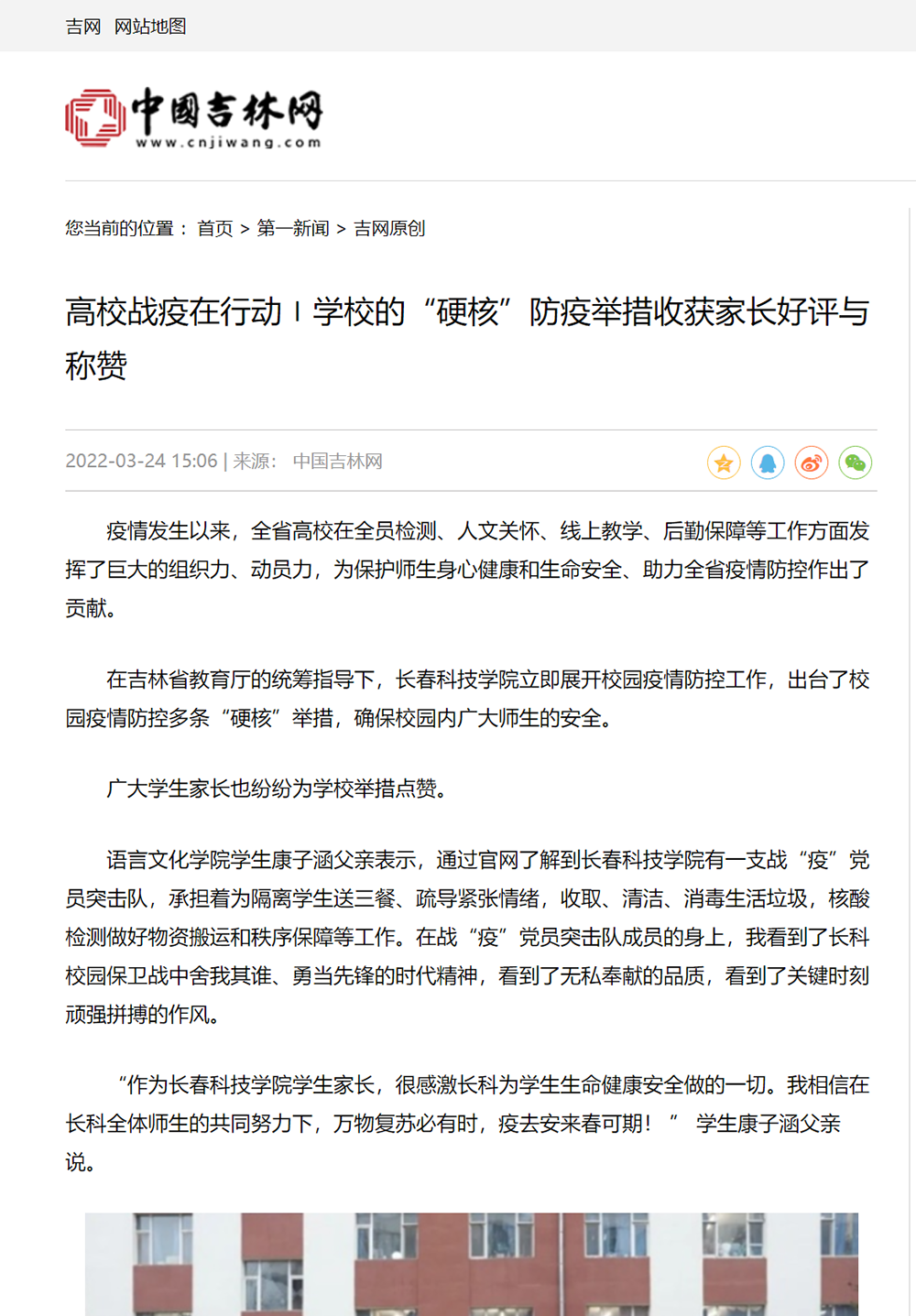“全面启动线上教学,坚守本职岗位,疫情防控是当前头等大事,落实落细每一项防疫工作,确保师生生命健康……”2022年3月,春风料峭、乍暖还寒,新冠疫情席卷长春大地。长春科技学院全体师生勠力同心,众志成城,精心织牢“四张网”,用实际行动传承长科校训精神,共同打响校园保卫战。