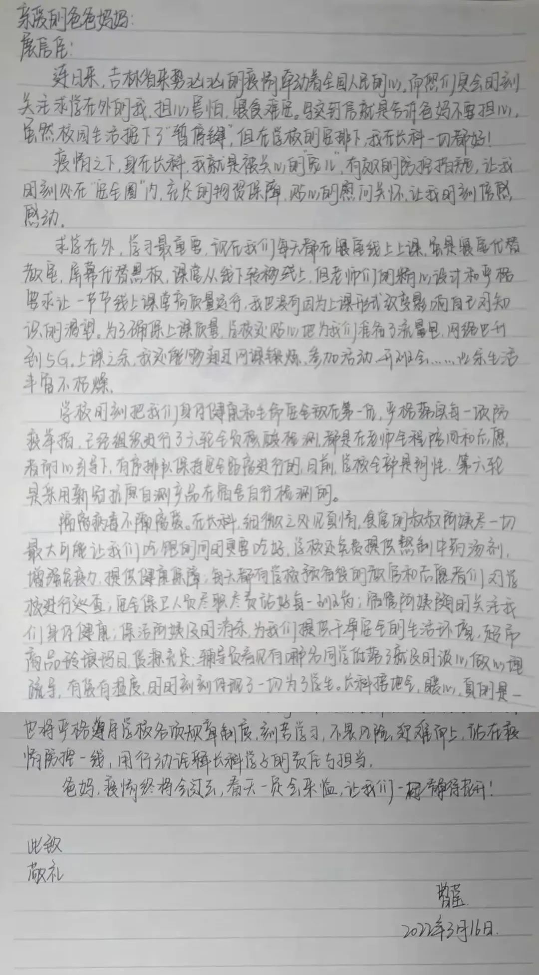 “同学们做好防护”。全体学工干部闻讯而动,积极发挥守门人、知心人、推进人作用,构建“学校-学院-班级-寝室-学生”五级疫情防控工作网络,确保学生思想教育、日常管理、宿舍卫生清洁、核酸检测、线上教学等工作横向到边、纵向到底。牢牢把防控的责任抗在肩上,把学生的安危放在心上,用细心、耐心、爱心关注着每一位学生,书写着抗击疫情“春天的答卷”。