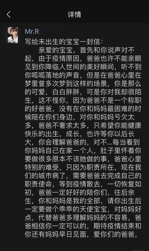 都说时势造英雄,可我知道世上没有从天而降的英雄。在朋友圈看到了同学的老公写给未出生宝宝的一封信,“由于疫情,爸爸要去抗疫一线奋战,将听不到你呱呱落地的声音,也不能陪伴在妈妈身边…”,一行热泪夺眶而出,我被舍小家顾大家、挺身而出的凡人所深深感动,也正是有这些逆行者,我们的国家才能国泰民安。