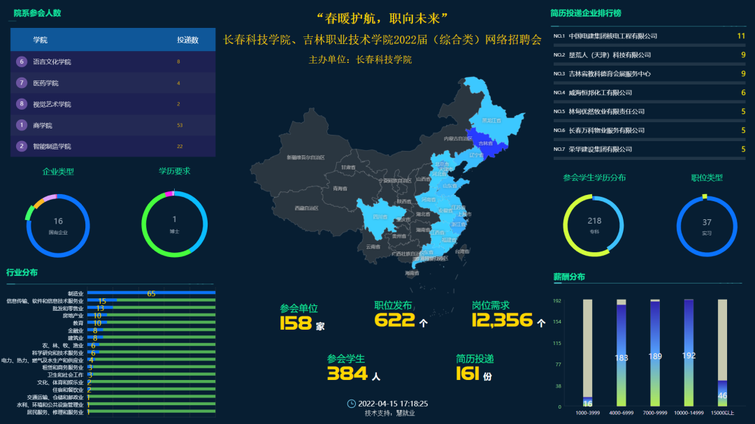来自全国的158家用人单位参加了本次网络双选会,共吸引384名应届毕业生参会。提供就业岗位 622个,招聘人数 12356人。双选会当天信息浏览量达 830次,毕业生投递求职简历161份,用人单位发出面试邀请308次,有效视频面试 130场,共有112名毕业生达成了就业意向。