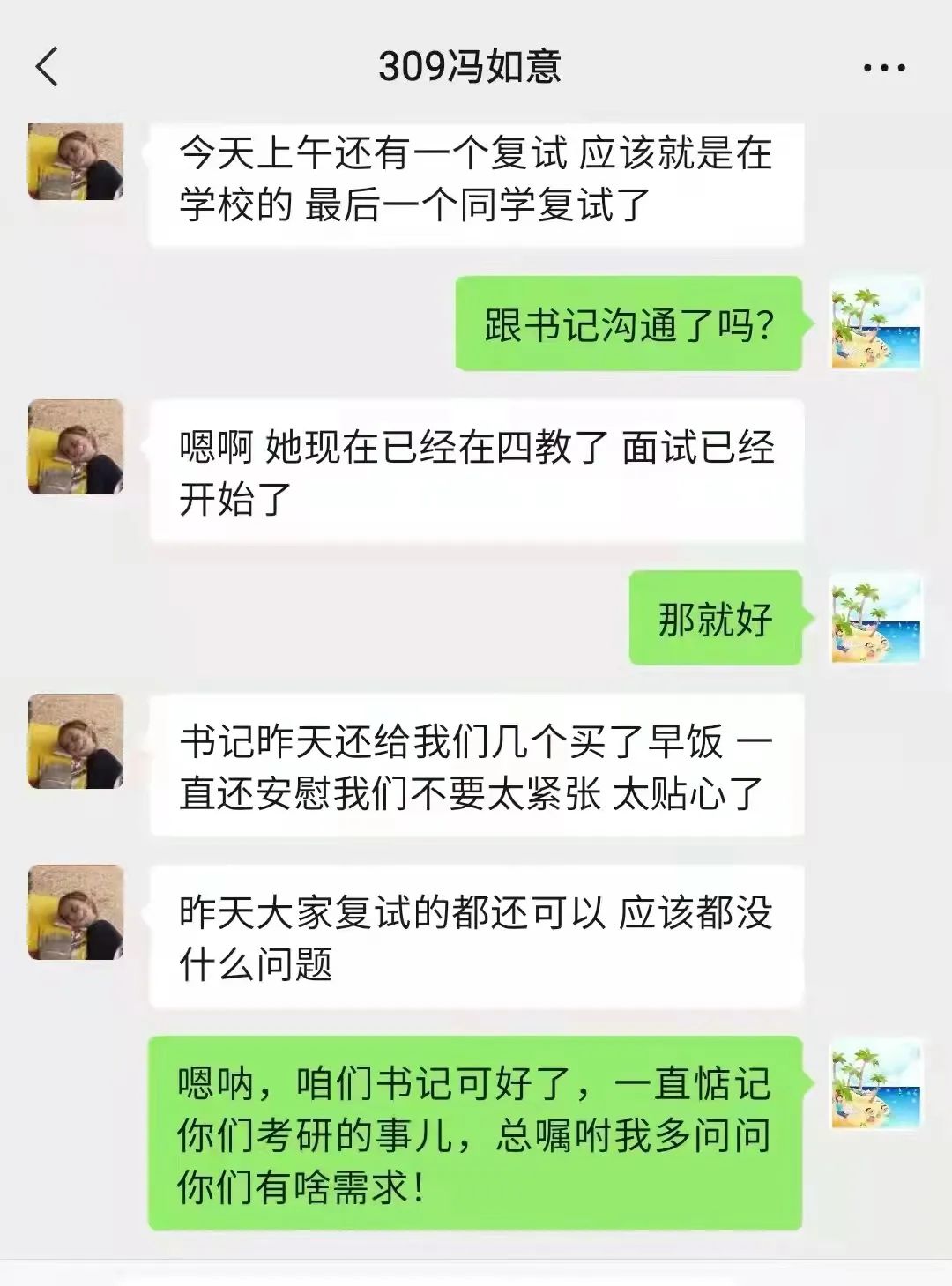 为解决疫情防控期间学生无法出校,且寝室存在场地环境狭小嘈杂、设备受限、网络不稳定等问题。在学生不出校且严格遵守疫情防控要求的前提下,将学校的会议室、办公室腾出作为“复试专用室”,为学生提供安静、舒适的复试环境,解决学生们研究生复试的场所需求,让辛苦努力取得复试资格的学子们能够安心参加研究生复试。副书记陈树森为复试学生买早餐,让她们元气满满。复试前,一直陪在学生们身边,为她们加油鼓劲,缓解她们复试的紧张情绪和心理压力,助力学生考研。
