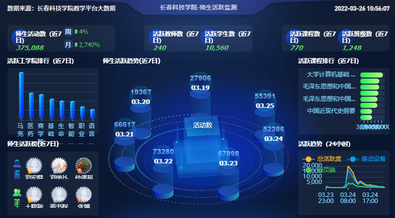 平台使用呈现“一主多辅”的特点,即以超星“一平三端”课程平台为主的学习平台,该平台的使用课程门数1089门次,使用率达到52.18%。同时辅以智慧树、学堂在线、钉钉、腾讯、中国大学MOOC网等11个线上教学平台。学校教师日访问量约为94508次,教师使用稳定。教师的行为多集中于课程内容的建设。发布活动52670次,作业是最受我校教师欢迎的教学功能,作业批阅量在不断提高。
