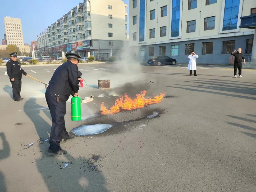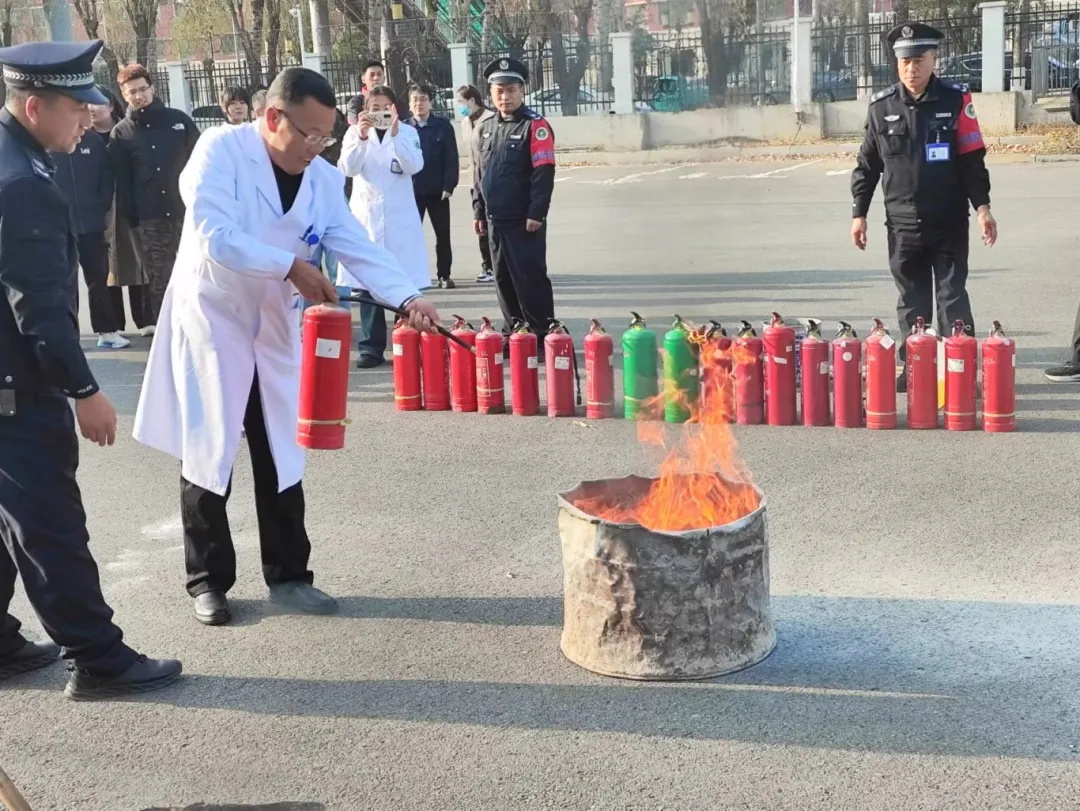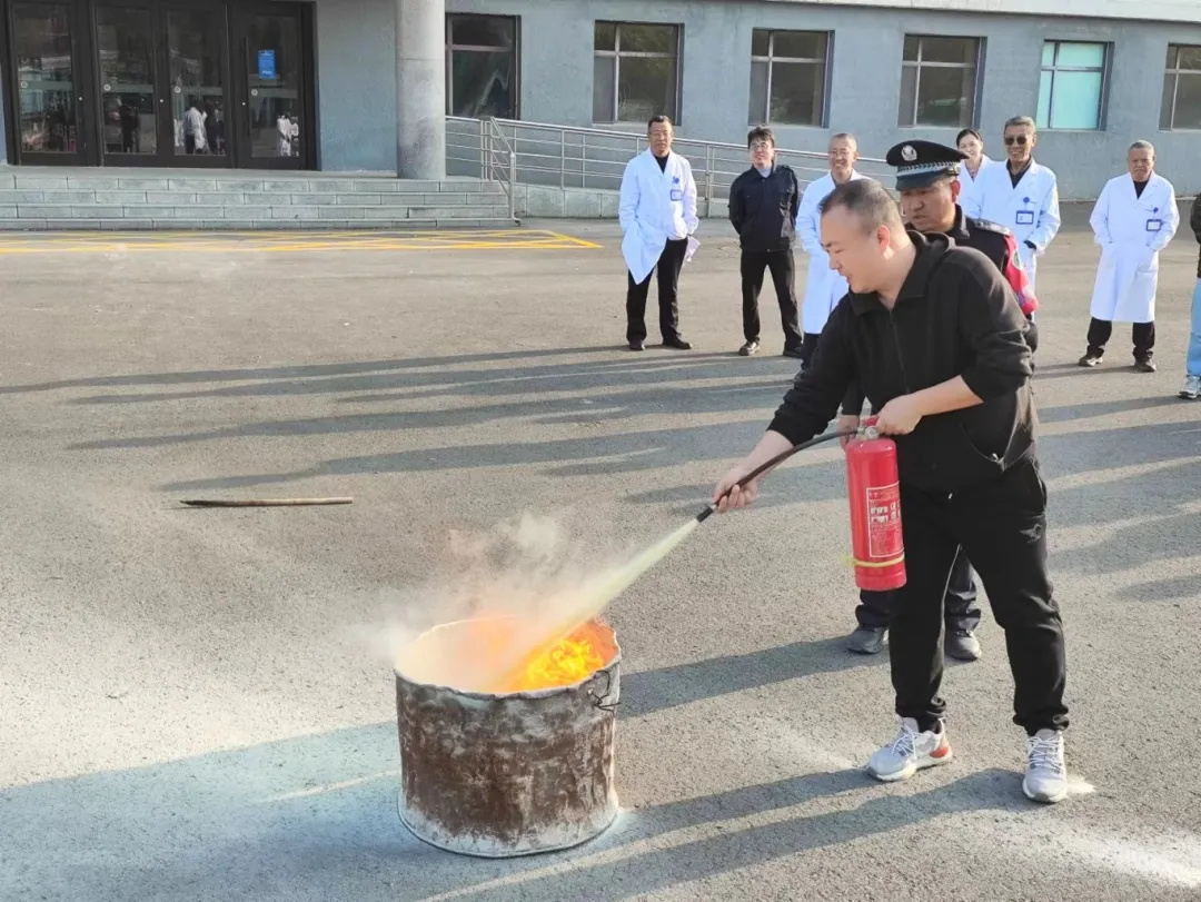 在消防演练中,全院员工学习并使用灭火器,做到全院不拉一人,逐一过筛子,让全体员工切身感受到初期火情时,不要害怕火,要使用灭火器去灭火。在灭火过程中使用干粉灭火器和水基灭火器灭火时的不同灭火效果。
