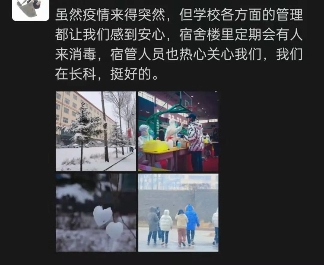 学生在朋友圈里写道:“虽然疫情来得突然,但学校各方面的管理都让我们感到安心,宿舍楼里定期会有人来消毒,宿管人员也热心关心我们,我们在长科,挺好的。”