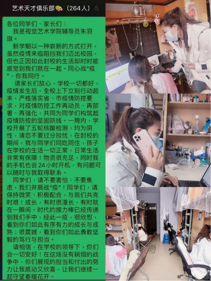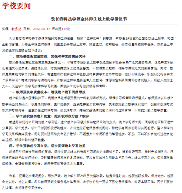 学校从3月10日起实行校园全封闭管理,所有师生一律不准出入校园,严格执行出入审批制度,实行“谁审批,谁负责”。学校要求全体在校人员必须全程规范佩戴口罩,保持1米以上社交距离,勤洗手,常通风,学校内设置废弃口罩专用回收箱,做好消毒及时清理;学校严格执行健康监测,“日报告”“零报告”等工作制度,确保疫情防控动态第一时间报送至学校相关部门;学校办公室与双阳区对接,建立联防联控机制;学校综合官网、微信、微博、抖音等平台有力有序开展信息发布、正面报道、科普宣传、舆论引导等工作;学校团委组织志愿服务活动,权力维护和打造健康有序的校园生活。