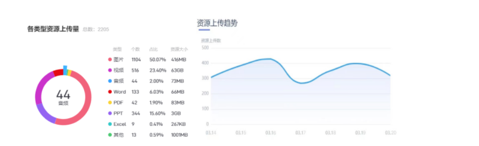平台使用呈现“一主多辅”的特点,即以超星“一平三端”课程平台为主的学习平台,该平台的使用课程门数925门次,使用率达到65.41%。同时辅以智慧树、学堂在线、钉钉、腾讯、中国大学MOOC网等11个线上教学平台。学校教师日访问量约为90367次,教师使用稳定。教师的行为多集中于课程内容的建设。发布活动43902次,作业是最受我校教师欢迎的教学功能,作业批阅量在不断提高。教师利用各种平台上传教学资源统计情况见图2,学生的访问量逐步上升(见表1)。