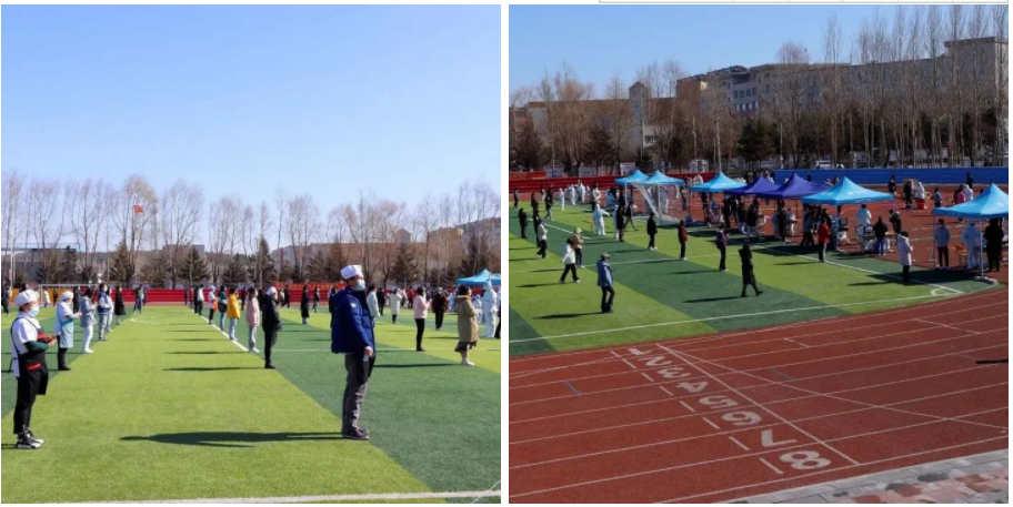 检测现场设在校田径场,设置12个采样台。走进检测现场,师生员工根据不同时间段安排,有序进入检测场地。医务人员身着防护服,戴口罩、护目镜和医用一次性手套,严格按照检测规范流程进行核酸采样。