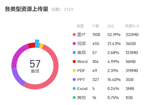平台使用呈现“一主多辅”的特点,即以超星“一平三端”课程平台为主的学习平台,该平台的使用课程门数823门次,使用率达到75.23%。同时辅以智慧树、学堂在线、钉钉、腾讯、中国大学MOOC网等11个其他线上教学平台。教师日访问量约为7457次,教师使用稳定。教师的行为多集中于课程内容的建设。发布活动46178次,作业是最受教师欢迎的教学功能,作业批阅量在不断提高。教师利用各种平台上传教学资源统计情况见图2、图3,学生的访问量逐步上升(见表4)。