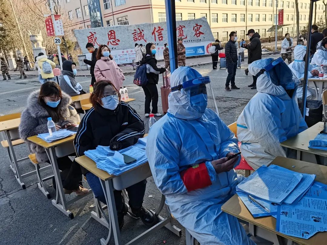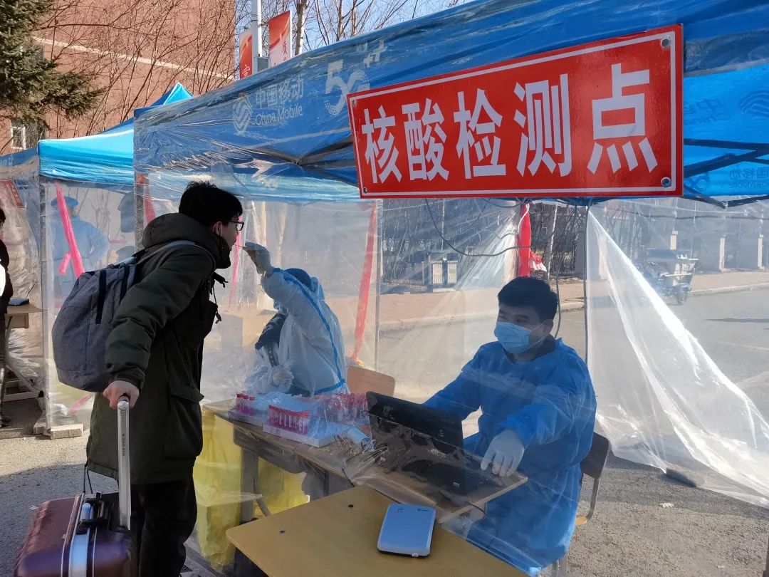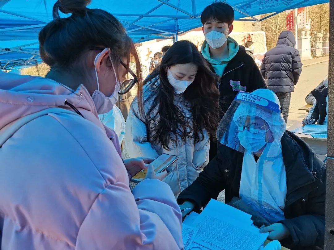 同学们进入校门后,值班的志愿者在寒风中认真查看每位返校同学的健康码和行程卡;翻找签到簿进行核对信息;手持体温枪测量体温,并及时维持现场秩序,提醒同学们排队等候。根据学校党支部和团委的统一安排部署,我校为全体学生在进入校园后再一次进行全员核酸检测,切实保障各位师生的身体健康。