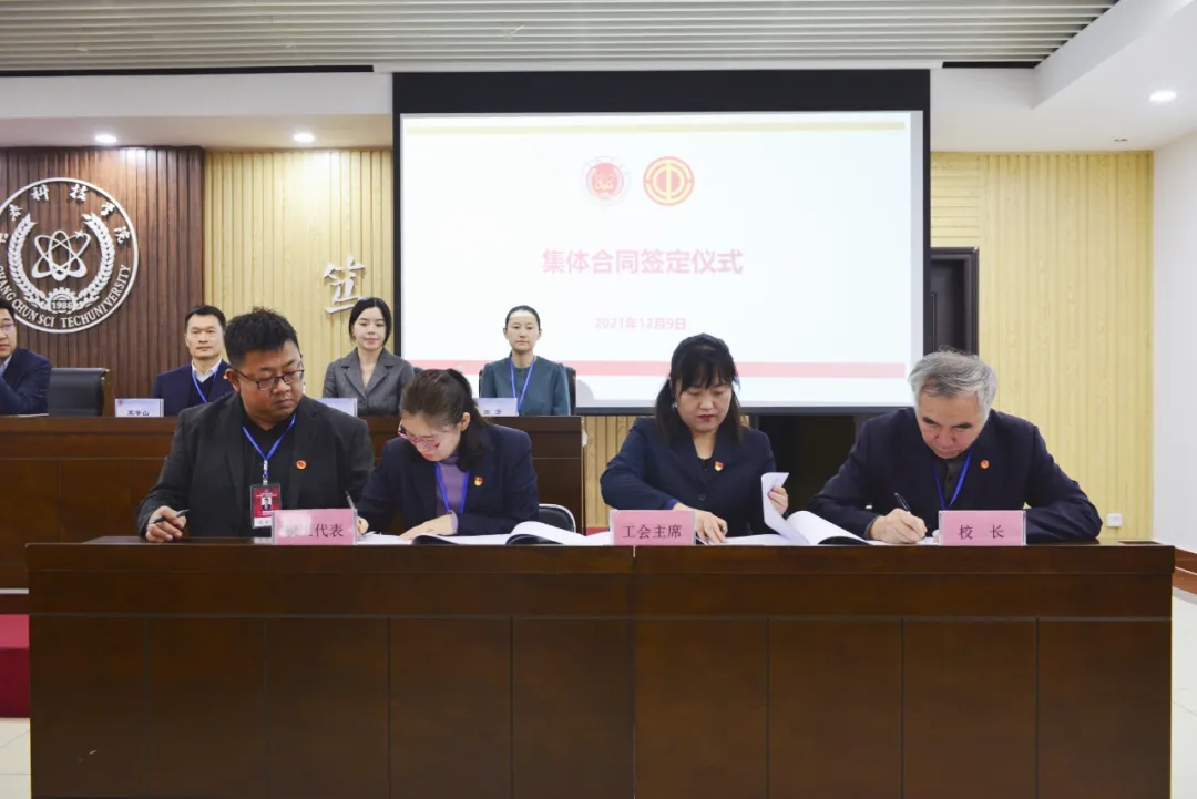 会上,秦磊校长代表学校,与校工会主席、教工代表臧连兴、隋庆茹签定《长春科技学院集体合同》。合同的签定,体现了平等协商,共谋发展的原则,兼顾并维护了学校、举办方、教职工三者利益,构建起和谐稳定的劳动关系,为创造良好的员工工作和生活条件、全心投入学校各项事业发展提供了保证。