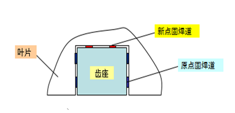 齿座点固焊道裂纹问题,通过力学分析,改变原来在齿座两侧坡口面对称点固4点,改变为齿座底部2点,形成类似“门折页”容易产生矫正时小角度转角的趋势,从几何学角度,巧妙
