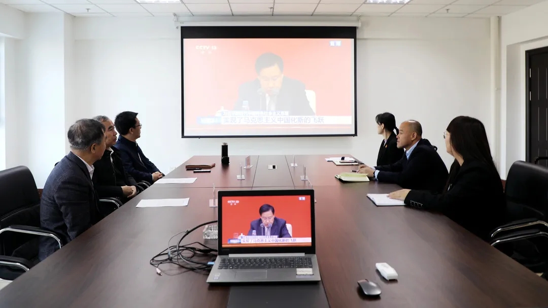 11月12日上午10时,在校行政楼802会议室,全体班子成员以党委理论中心组学习会方式集中收看新闻发布会并全文学习《中国共产党第十九届中央委员会第六次全体会议公报》(下简称《公报》)。