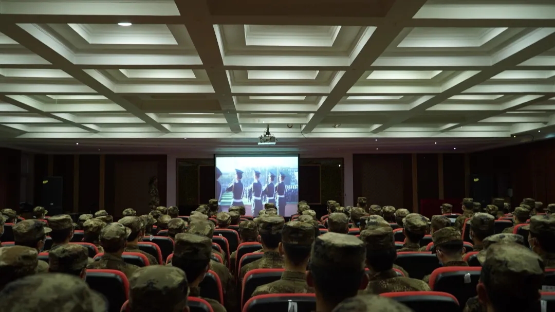 “踏,踏,踏,踏……”整齐划一的脚步声响起。全体成员观看三军仪仗队训练和庆祝中华人民共和国成立70周年阅兵回放,会场内士气高涨,氛围热烈,授衔仪式在庄严的阅兵仪式中结束。