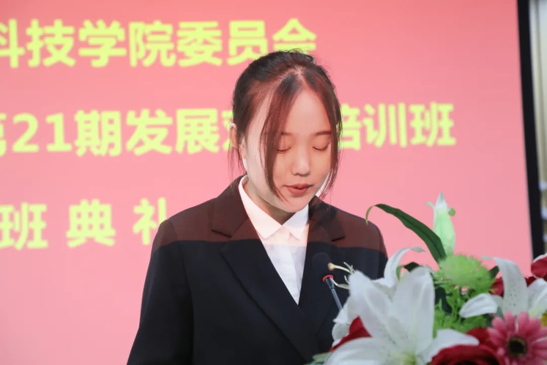 会议在雄壮的《国歌》声中拉开帷幕,语言文化学院 2019级汉语国际教育专业潘悦同学代表全体培训学员发言,他说:作为一名党的发展对象,要以党员的标准严格要求自己、鞭策自己,向革命先辈学习,向优秀共产党员学习,发挥共产党员的先锋模范作用,做到“严于律己,宽以待人”,在党组织需要我们的时候挺身而出,无愧于党组织对我们的信任与帮助。
