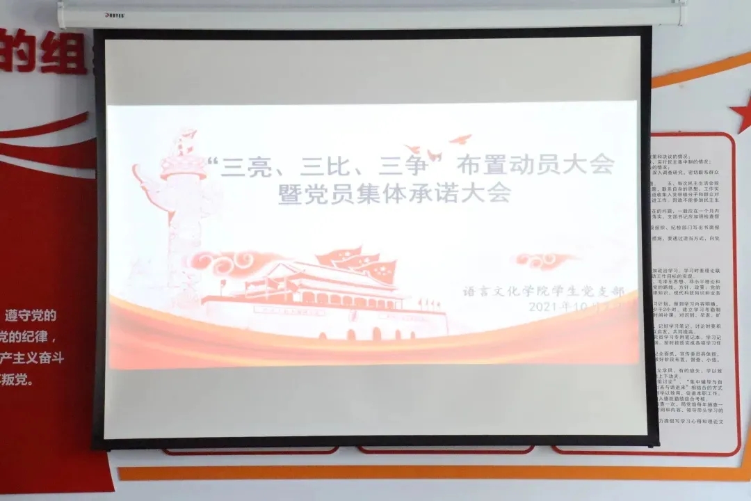 为激励学生党员坚定理想信念,增强学生党员的服务意识,激发学院学生党员的积极性和发挥先锋模范作用。10月7日语言文化学院学生党支部在第一教学楼121党团活动室开展“三亮、三比、三争 ”布置动员大会暨党员集体承诺大会。