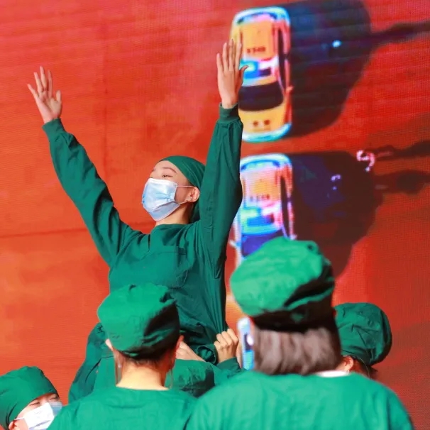 在《疫·晴》的表演中,我们感谢那些逆行而上的专家、白衣天使、军人和志愿者们,替我们负重前行。
