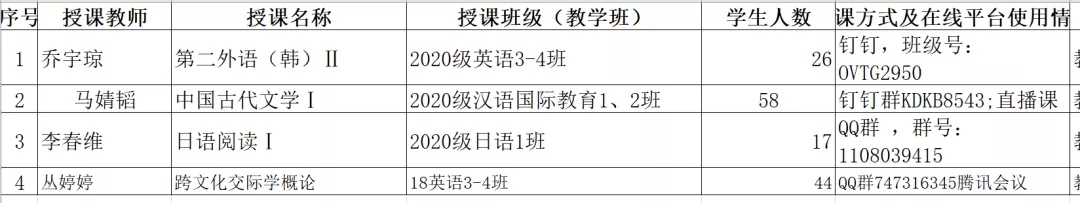 语言文化学院领导班子分别进入了朝鲜(韩)语专业教师乔宇琼的第二外语(韩)Ⅱ课程、汉语国际教育专业教师马婧韬的中国古代文学Ⅰ课程、日语专业教师李春维的日语阅读Ⅰ课程和英语专业教师丛婷婷的跨文化交际学概论课程的课堂。各位教师结合专业特点、课程教学实际需要,通过腾讯会议、QQ群、钉钉等线上教学媒介进行在线授课,并通过QQ群或微信群进行课下实时答疑,确保教学活动的顺利开展。