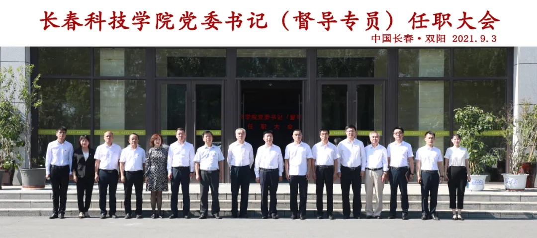 2021年9月3日,长春科技学院党委书记(督导专员)任职大会暨“同在党旗下 携手添光彩”结对共建仪式在行政楼409会议室举行。省教育厅党组成员、副厅长、省委教育工委副书记孙长智,省教育厅高教处处长宋辉,吉林体育学院党委书记郑永奎,长春中医药大学党委书记张兴海,吉林体育学院党委组织部部长勾晓秋,长春中医药大学党委组织部部长王延博,吉林体育学院党委组织部李长青,学校董事长张电达,校长秦磊,原党委书记(督导专员)陈延民,新任党委书记(督导专员)林佳彬,学校领导班子成员,以及各学院、各部门党政负责同志出席大会。会议由校长秦磊主持。