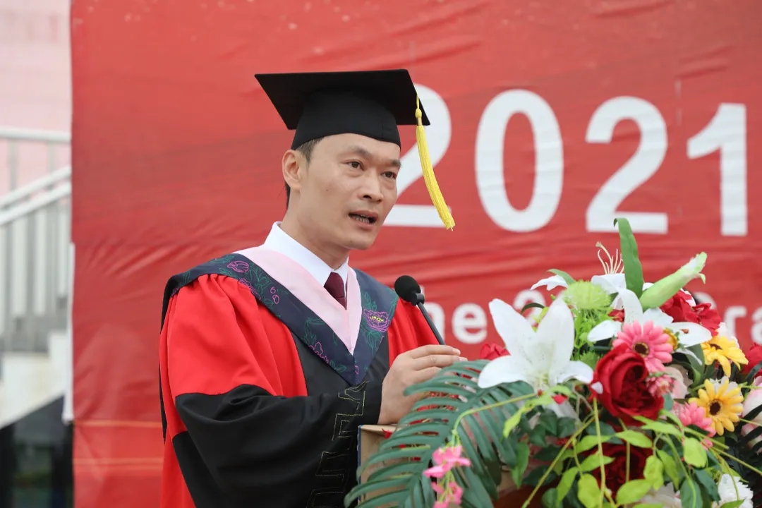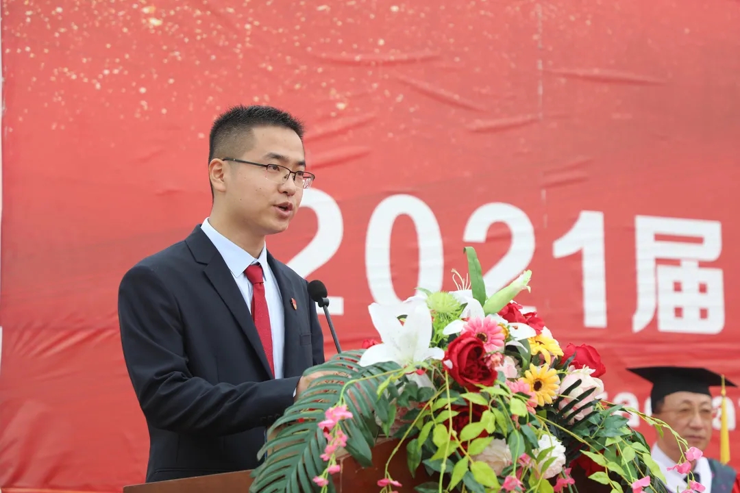 医药学院中药学专业孙光轩代表毕业学子发言,回顾了求学的青春时光,表达了将以“崇德至善、笃学强能”校训作为动力,勇敢面对未来各种挑战豪迈情怀。智能制造学院郝允慧作为教师代表发言,寄语毕业学子心怀梦想,把握眼前,做好规划,脚踏实地走好每一步,不忘初心,向着心中的理想拼搏前进。