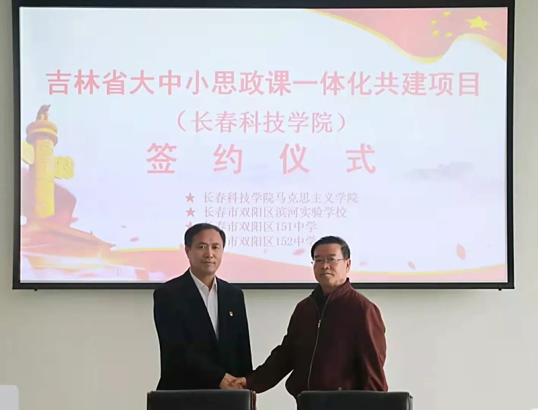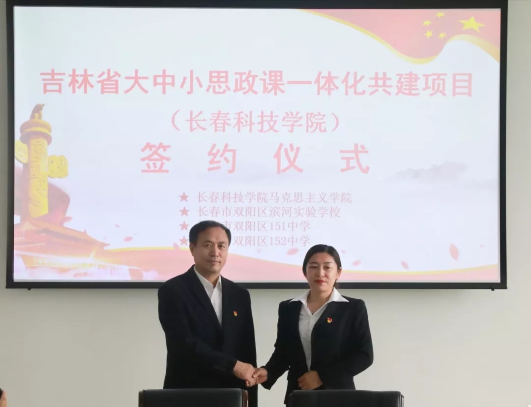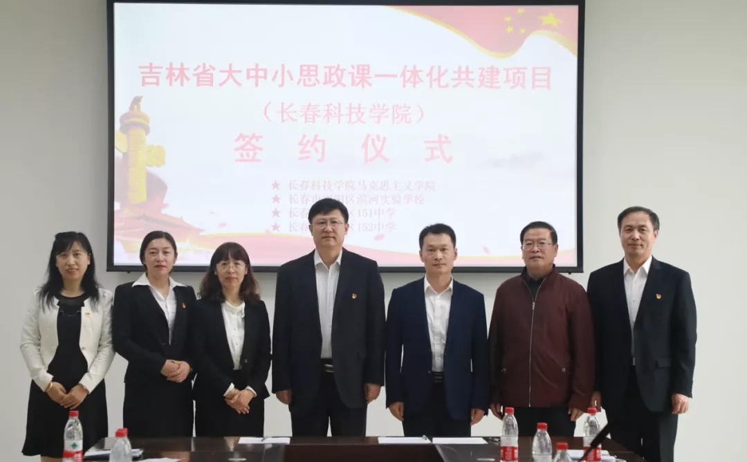 签约仪式于5月28日在我校行政楼403会议室举行,与会领导有:长春科技学院党委书记陈延民、党委副书记宋学山,长春市151中学副书记陈峰、长春市152中学副书记张宪平、双阳区教育局基础教育科赵丽辉,双阳区滨河实验学校副书记吕萍,以及共建学校的部分思政课教师。会议由遇洪涛院长主持。