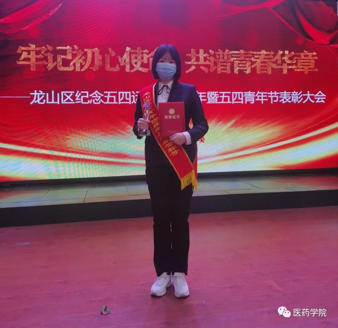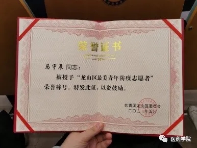 志愿者活动虽然暂时结束,但她无私奉献的精神深深感染着每一个人。相信她的这份精神会激励更多的医药学子投身于志愿者行列中,也会在我们之中掀起甘于奉献,为国为民的良好风气。最后再次恭喜我院学子马宇辰荣获“龙山区最美青年防疫志愿者”称号,砥砺奋进星光不问赶路人,时光不负有心人。(学生记者:袁健翔)