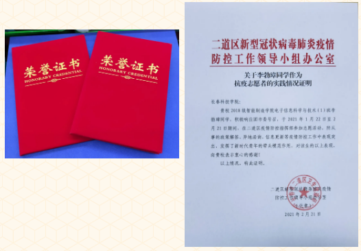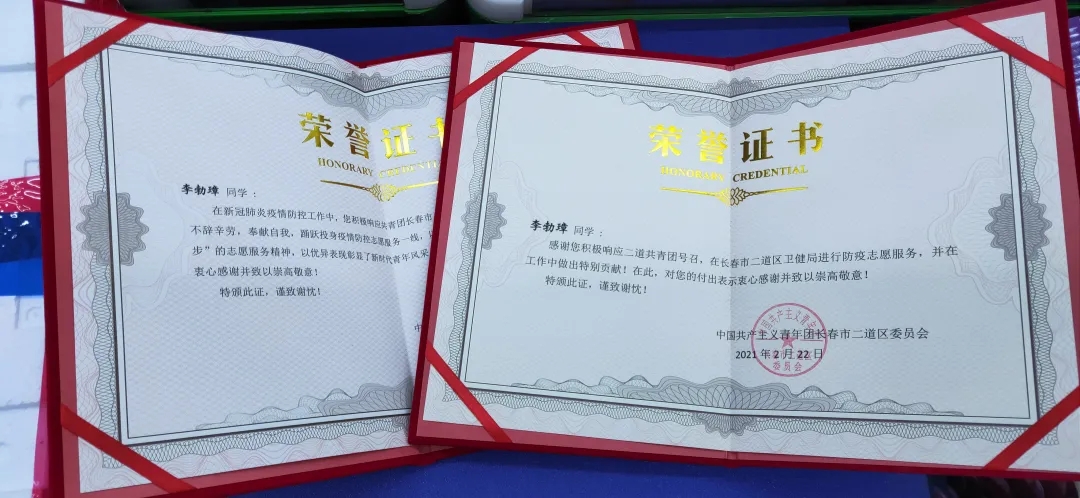 在前段时间长春市疫情防控的关联时期,他作为一名中共预备党员,积极响应我校团委招募志愿者的号召,投入到疫情防控中去,他报名加入了长春市二道区青年志愿者团队,进行了长达一个多月的疫情防控志愿服务工作。在此期间,李勃璋同学充分展现了长科学子的精神风貌和新时代大学生的责任担当。