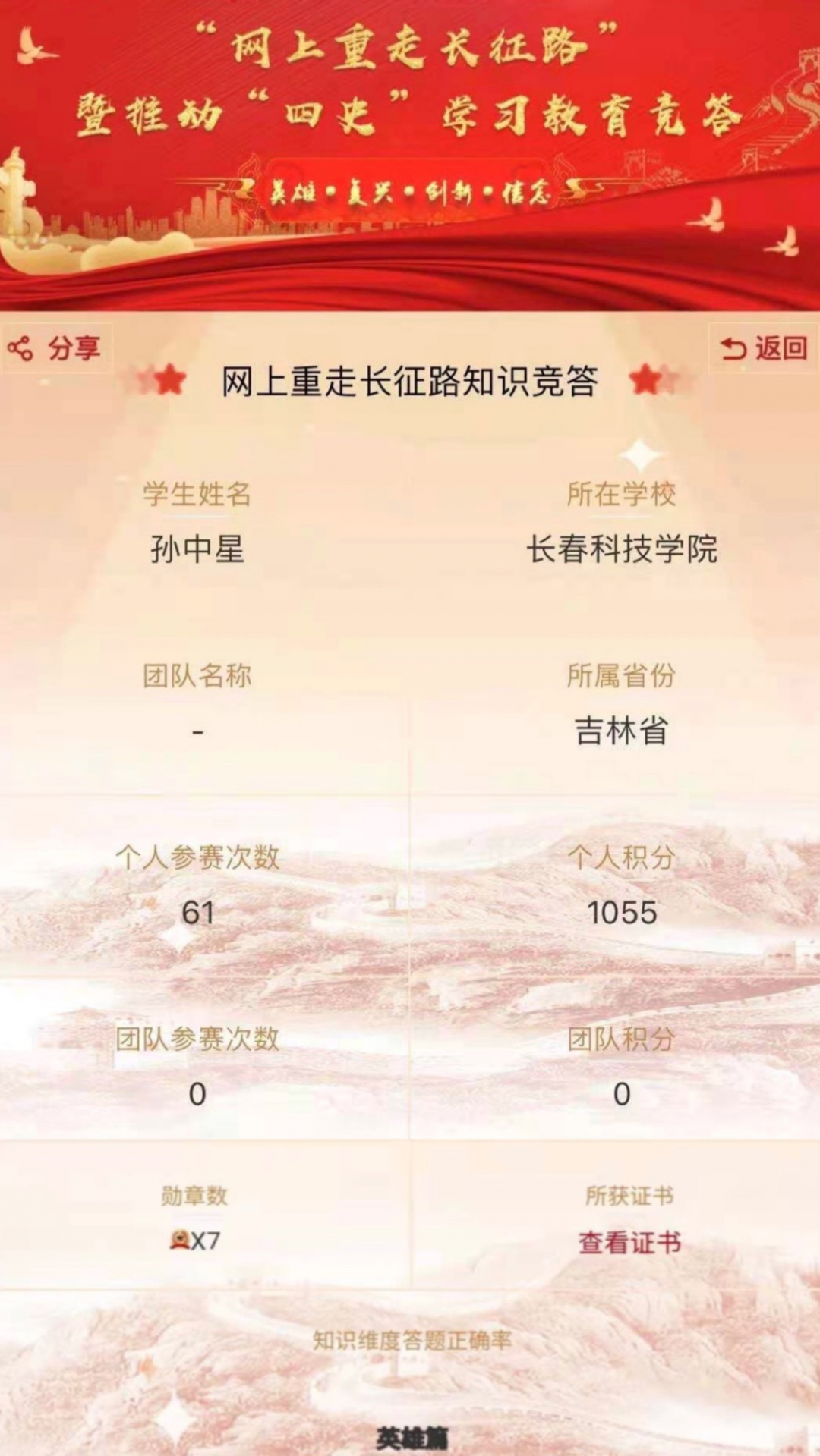2021年是中国共产党建党100周年,在这个继往开来,举国欢庆的时间节点上,为使同学们更好地把握时代的脉搏,了解历史的事实真相,理清历史的发展脉络,探析历史的前进规律,深入学好“党史、新中国史、改革开放史、社会主义发展史”(以下简称“四史“),教育部面向全国高校师生组织开展“网上重走长征路”暨推动“四史”学习教育系列活动,生命科学学院组织同学们积极参与学四史线上答题活动。