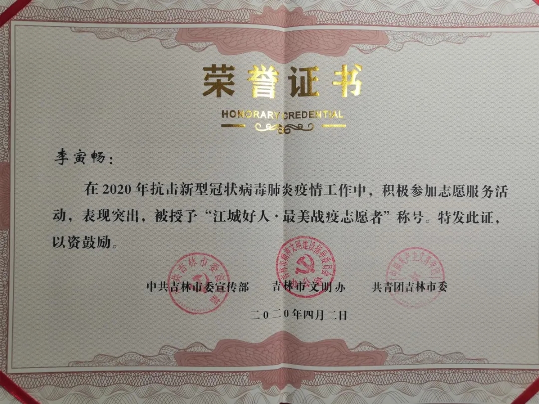 家住吉林省吉林市的长科商学院2018级财务管理4班学生李寅畅,曾在2020年的疫情防控工作中获得“江城好人•最美战疫志愿者”荣誉称号。寒假回家后就时刻关注疫情情况,当得知需要疫情防控志愿者时,她毫不犹豫报名参加,当被提及,你为什么选择又一次去当志愿者,她回答到:“作为一名入党积极分子,我更要像一名党员一样冲锋在前。”