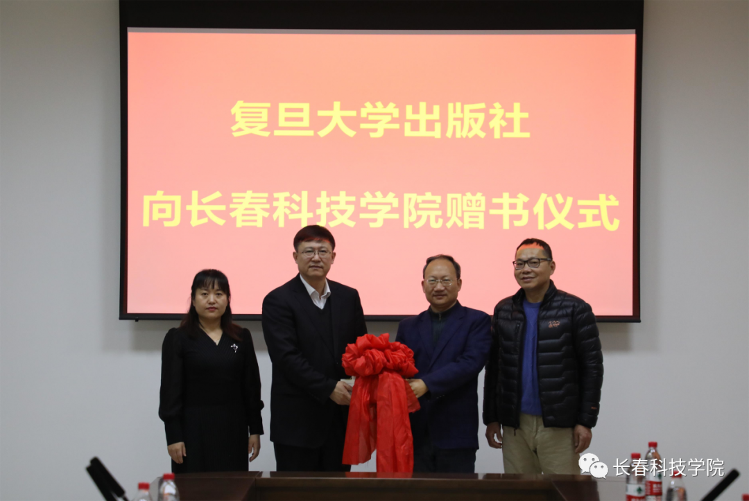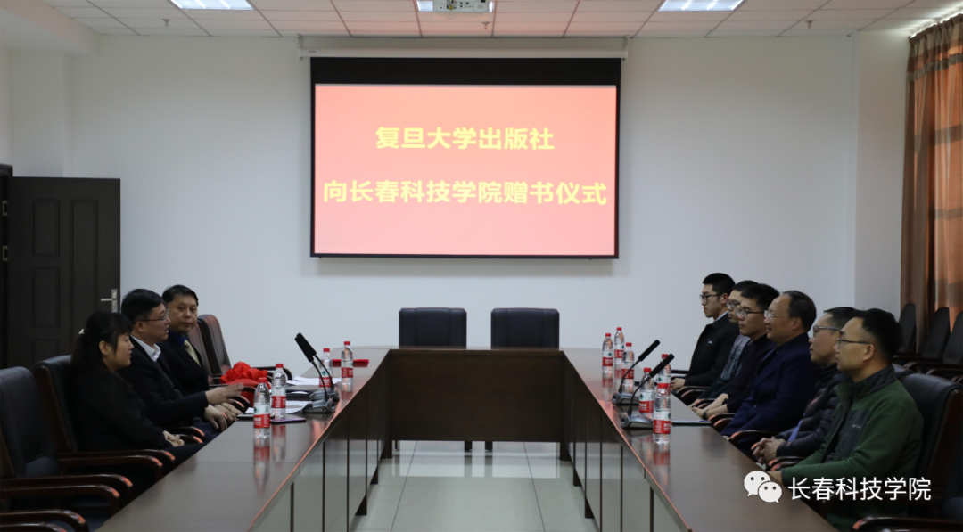 12月7日上午,复旦大学出版社第四次向长春科技学院捐赠图书仪式,在行政楼405会议室成功举行。复旦大学出版社总经理李华、总经理助理仇文平、院校合作部副主任洪少颖、经理夏昆;长春科技学院党委书记陈延民、副校长高杰、教务处长唐敬仙、图书馆馆长郝中出席捐赠仪式。