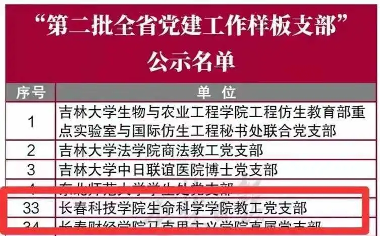 教工支部:吉林省教育厅发布了《关于对第二批新时代全省高校党建示范创建和质量创优工作评审结果的公示》。经高校申报、资格审查、专家评审、省委教育工委书记会议研究审议,荣获“党建工作样板支部”。