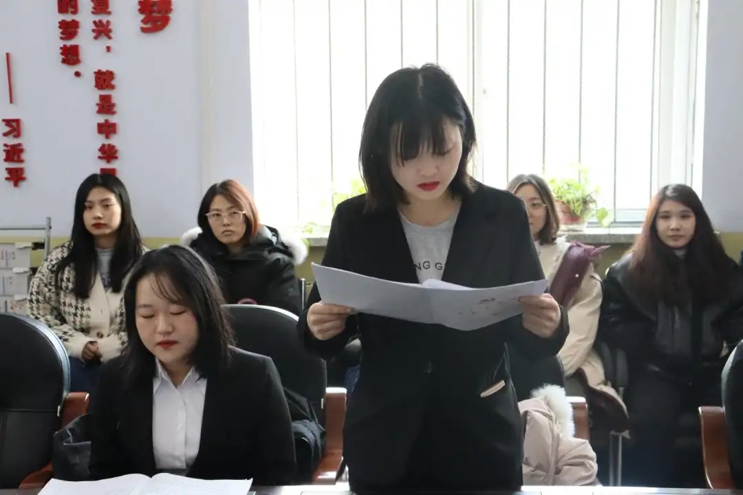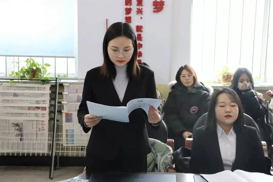 为了积极响应党的号召,推进语言文化学院学生党员队伍建设,增强语言文化学院学生党支部队伍的凝聚力和战斗力,近日,长春科技学院语言文化学院于第一教学楼121党员活动室组织召开了学生党支部预备党员接收大会。本次会议由学生党支部书记姜月主持,党总支副书记陈恭鑫,组织委员张贺亮,宣传委员谷振宇,全体学生党员以及全体预备党员出席了本次会议。