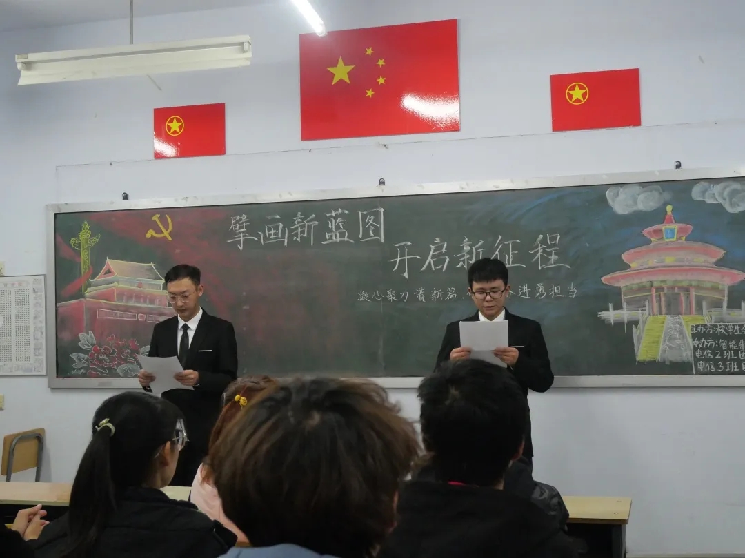 为进一步贯彻落实党的十九大精神,大力唱响礼赞新中国、奋进新时代的青春主旋律,大力弘扬爱国主义精神,坚定理想信念,职业技术学院20级各班于11月22日晚自习组织开展了“擘画新蓝图,开启新征程”主题团会。