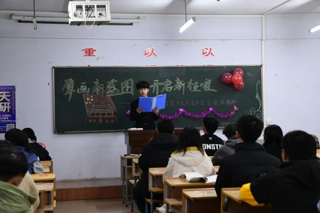 为了全面深入地学习贯彻中国共产党第十九届五中全会精神,团结引领语言文化学院学生听党话、跟党走,以奋发向上的精神状态,以高度的思想和行动学习贯彻党的十九大五中全会精神,语言文化学院于11月22日下午六点半在第一教学楼以班级为单位召开了“擎画新蓝图,开启新征程”主题团会。此次团会由2020级辅导员张贺亮主持,全体2020级学生参加了此次团会。