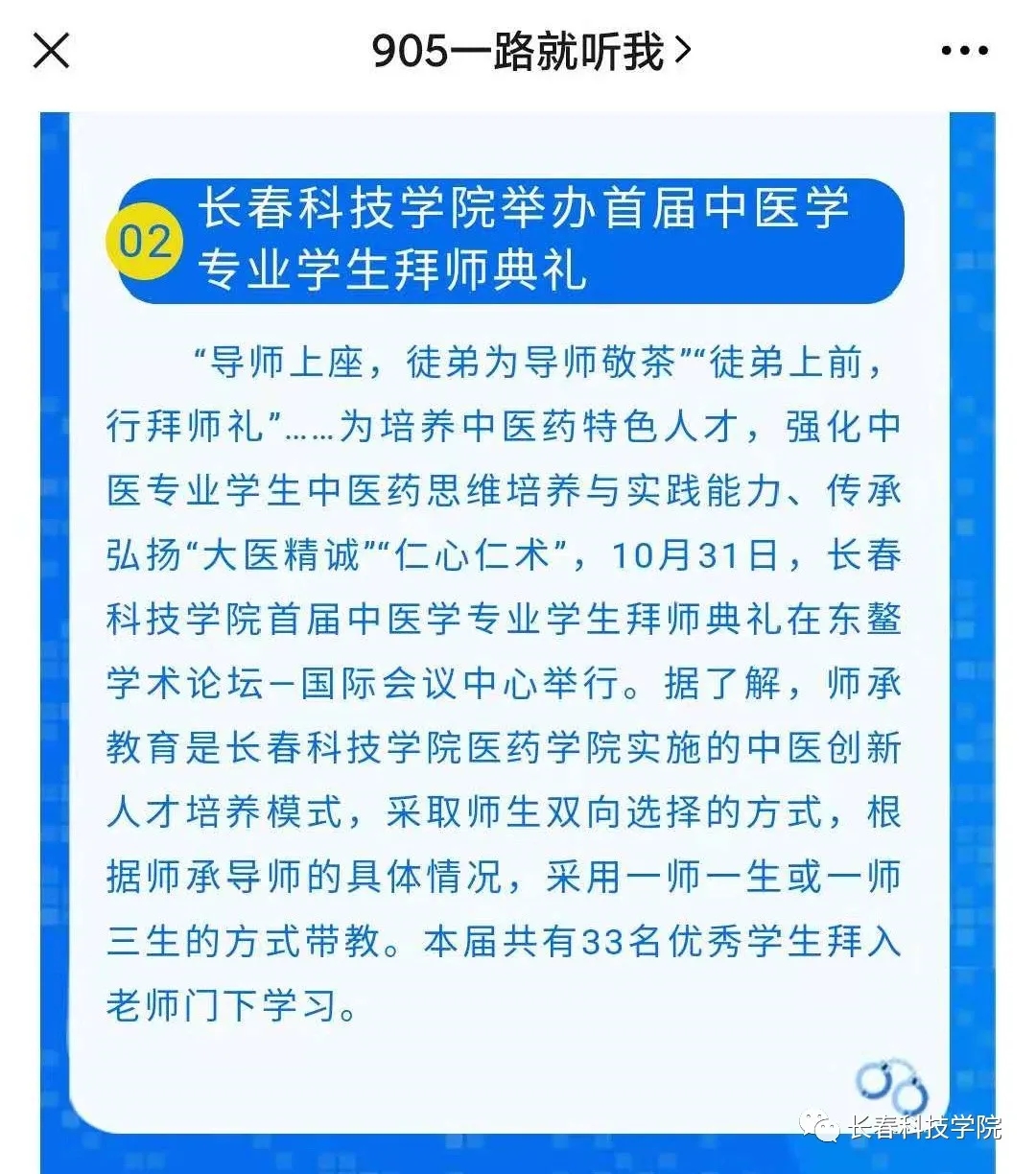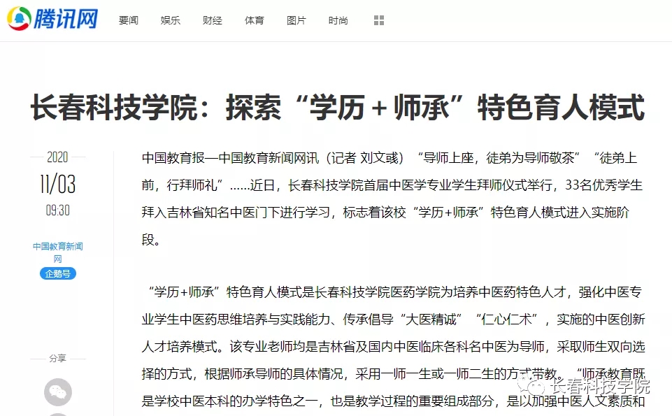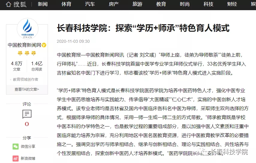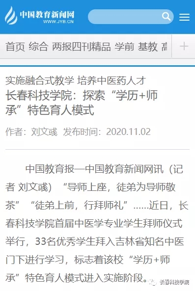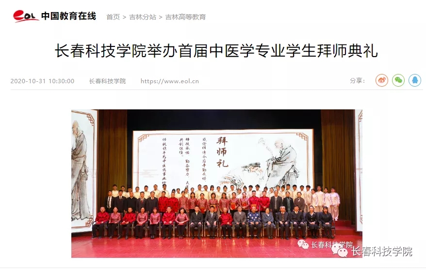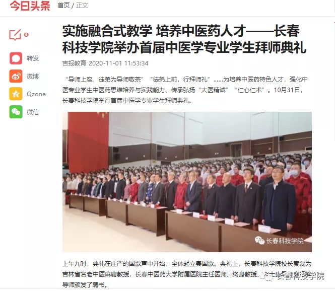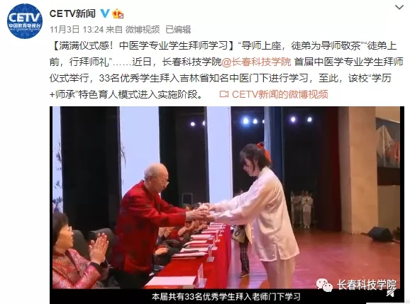 10月31日,长春科技学院首届中医学专业学生拜师仪式东鳌学术论坛—国际会议中心举行,33名优秀学生拜入吉林省知名中医门下学习,标志着学校“学历+师承”特色育人模式进入实施阶段。