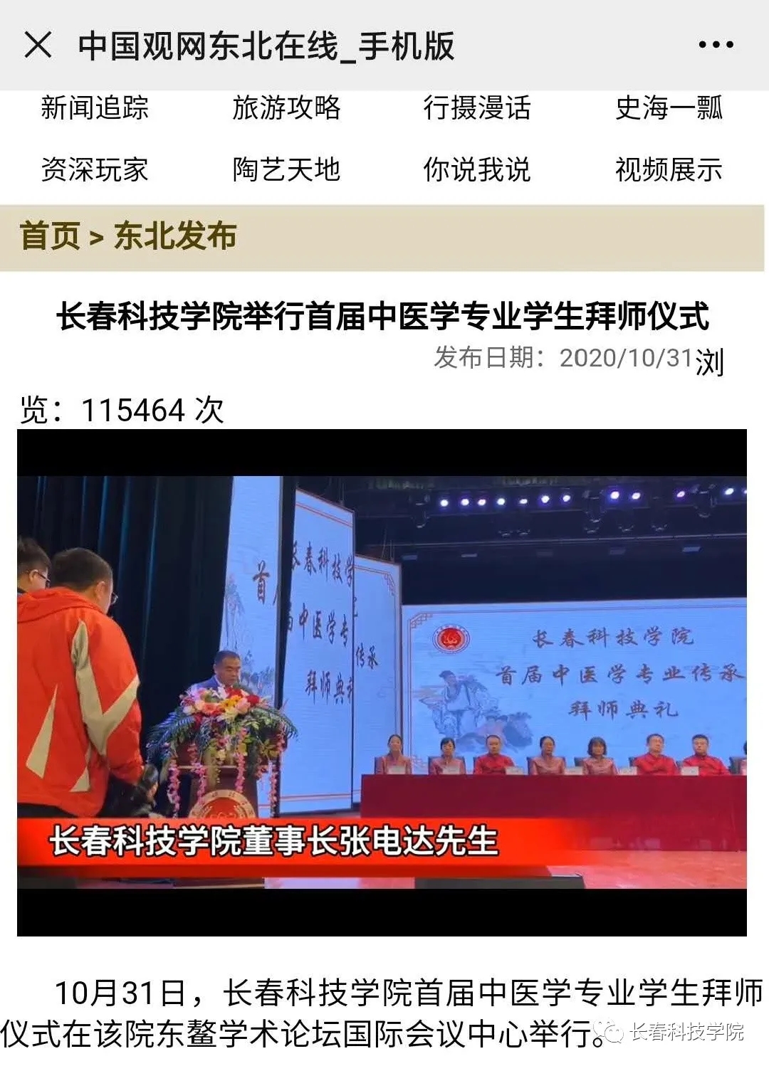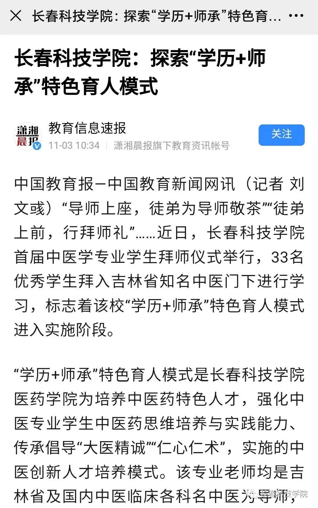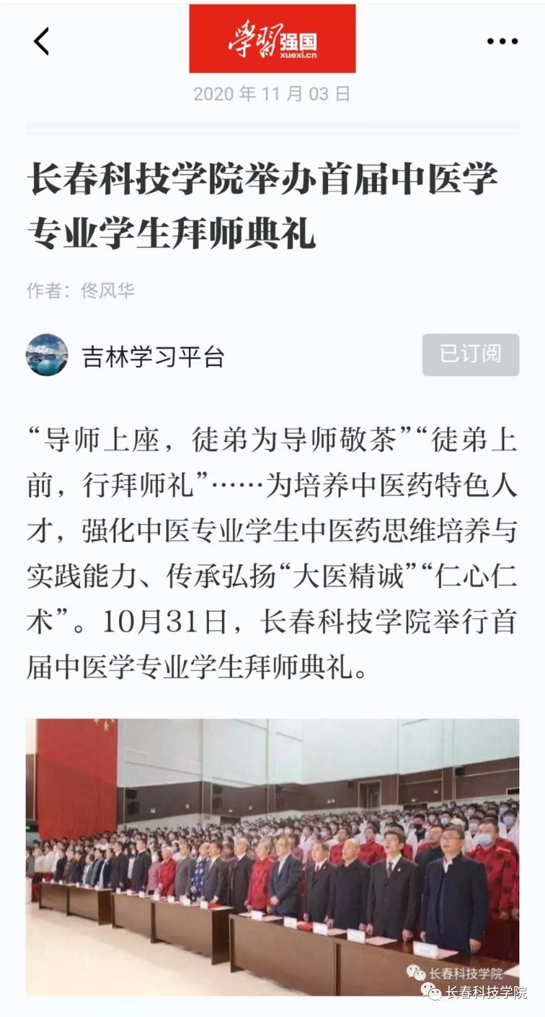 10月31日,长春科技学院首届中医学专业学生拜师仪式东鳌学术论坛—国际会议中心举行,33名优秀学生拜入吉林省知名中医门下学习,标志着学校“学历+师承”特色育人模式进入实施阶段。
