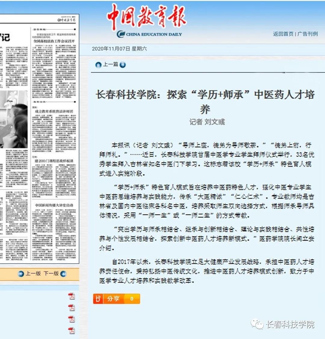 师承教育是长春科技学院医药学院实施的中医创新人才培养模式,该专业老师均是吉林省及国内中医临床各科名中医为导师(首次导师遴选依托长春中医药大学、吉林省中医药科学院、长春市中医院),采取师生双向选择的方式,根据师承导师的具体情况,采用一师一生或一师二生的方式带教。通过师承教育,发挥老中医专家在中医药继承发展和人才培养中的“传帮带”作用,学习掌握导师诊疗经验、理解诊疗过程中的难点及重点,巩固学生所学的中医基础理论知识、强化中医临床专业知识,培养热爱中医事业、品学兼优的未来中医临床医师。