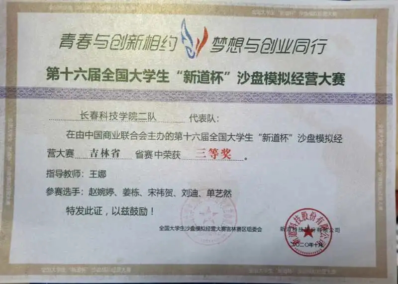 第十六届全国大学生“新道杯”沙盘模拟经营大赛吉林省赛区总决赛圆满结束。本次大赛由吉林省教育厅指导,吉林省大学生沙盘模拟大赛组委会主办。由于疫情原因,本次比赛采用录制视频、校内比赛的形式。