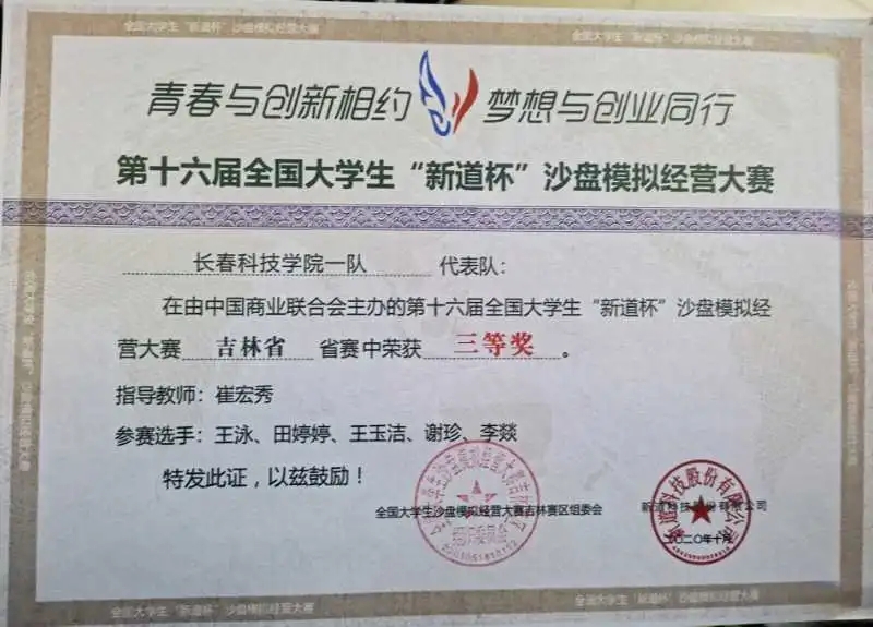 吉林省本科组共30多所学校,60多个团队参赛,分为A、B、C三个赛区。通过模拟总经理、财务总监、采购总监、生产总监、销售总监、团队合作体验了完整的企业运营过程。经过激烈的角逐,在我院工商管理系系主任崔宏秀老师的耐心指导下,我校参加比赛的两个团队荣获了三等奖的优异成绩。