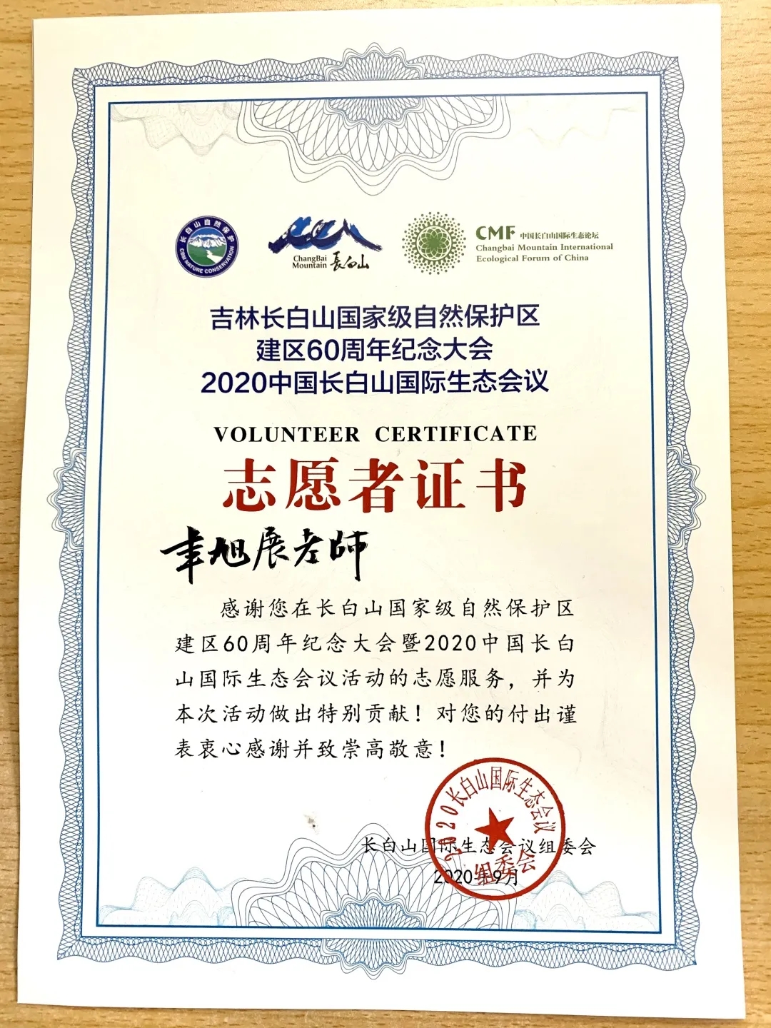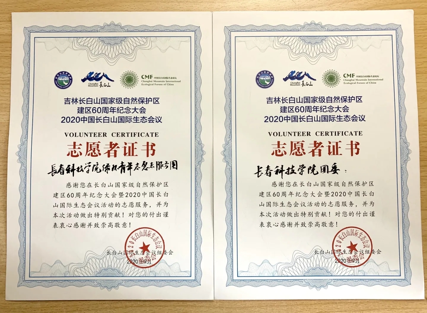 近期,校团委收到长白山国际生态会议组委会颁发的志愿者证书,学校团委、绿环志愿者服务团、带队老师韦旭展及16名志愿者得到了嘉奖。