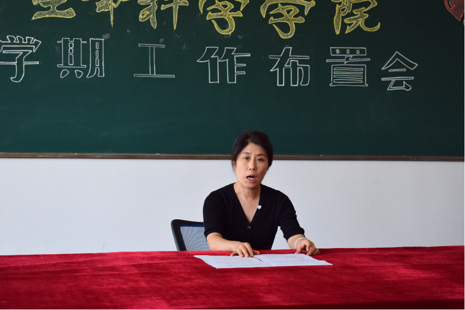 随后刘玉敏副院长讲话要求全面落实开学前的准备工作以及学期初教学工作安排,做好学期初各项教学工作,加强教学质量监控,稳定教学秩序。明确岗位责任,提高工作率与竞争活力。希望全体教师高度重视,认真落实,积极主动地开展工作,全面提升教育教学质量,在教学工作中取得新的突破。