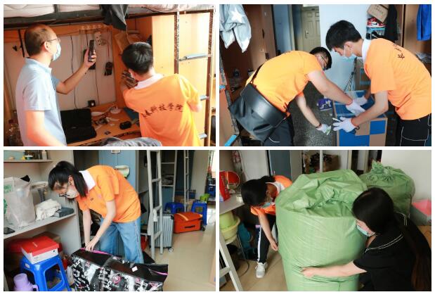 在为毕业生打包行李的过程中,志愿者和老师变身“带货”主播,宿舍也变成“直播间”,通过远程视频与毕业生进行远程沟通,将一些大件物品、小件物品分类打包,贵重易碎物品单独列表邮寄,老师也会在每件包裹封口邮寄前,再三与毕业生确定邮寄地址以及是否有未打包的东西。